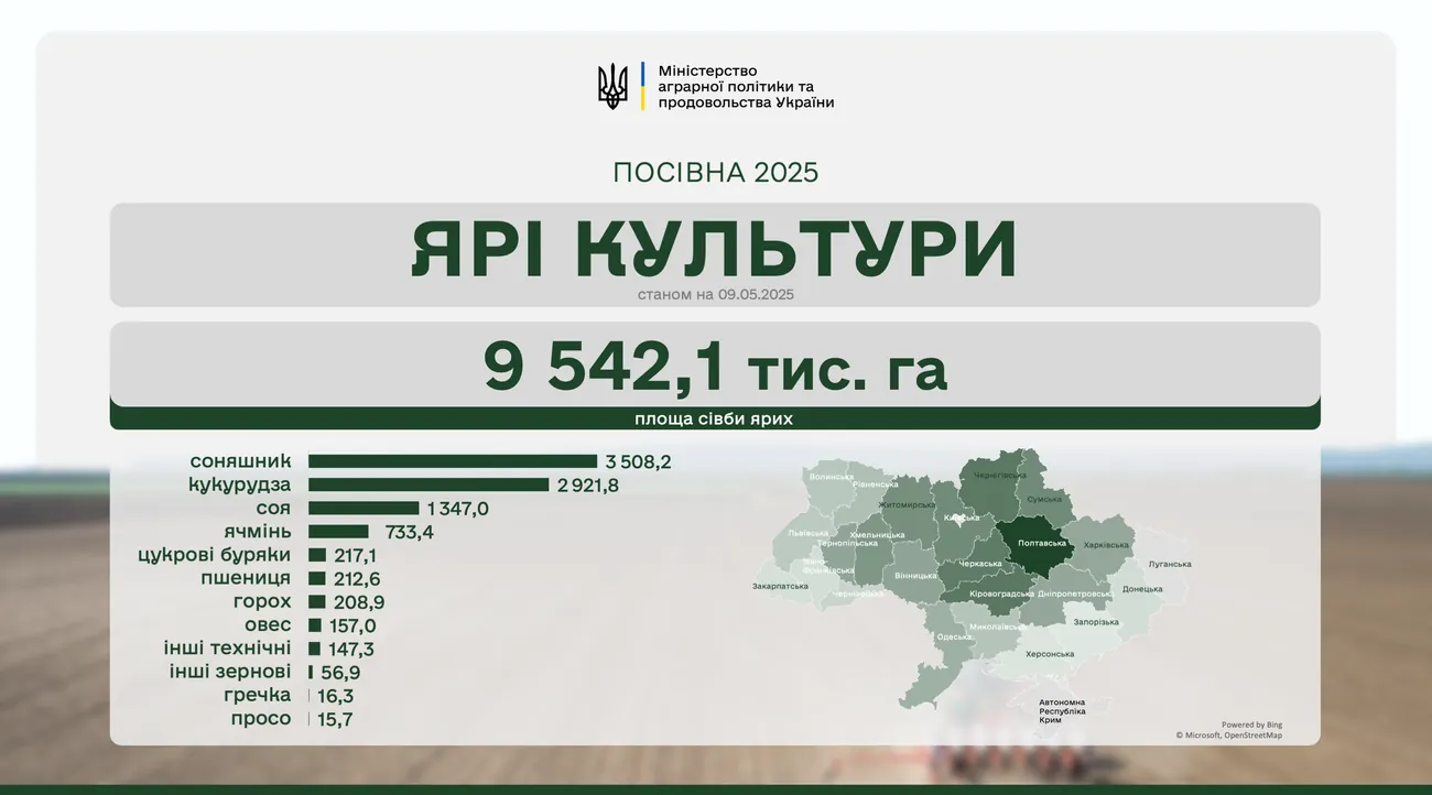 Станом на 9 травня 2025 року аграрії всіх областей України засіяли 4,32 млн га ярих зернових та зернобобових культур. Це становить 76% від прогнозованих площ