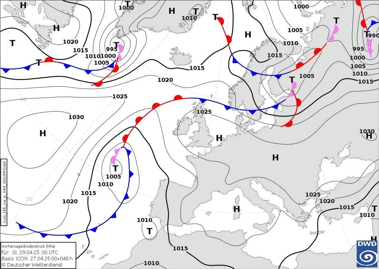 Україна завтра належатиме до масштабної області підвищеного атмосферного тиску, яка займає значну частину Європи. Карта. Тому 29-го квітня переважатиме суха, із сонцем, погода