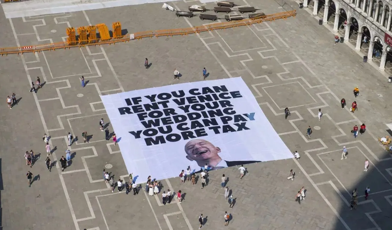 У понеділок активісти вивісили у соборі Святого Марка банер із зображенням Безоса та написом: