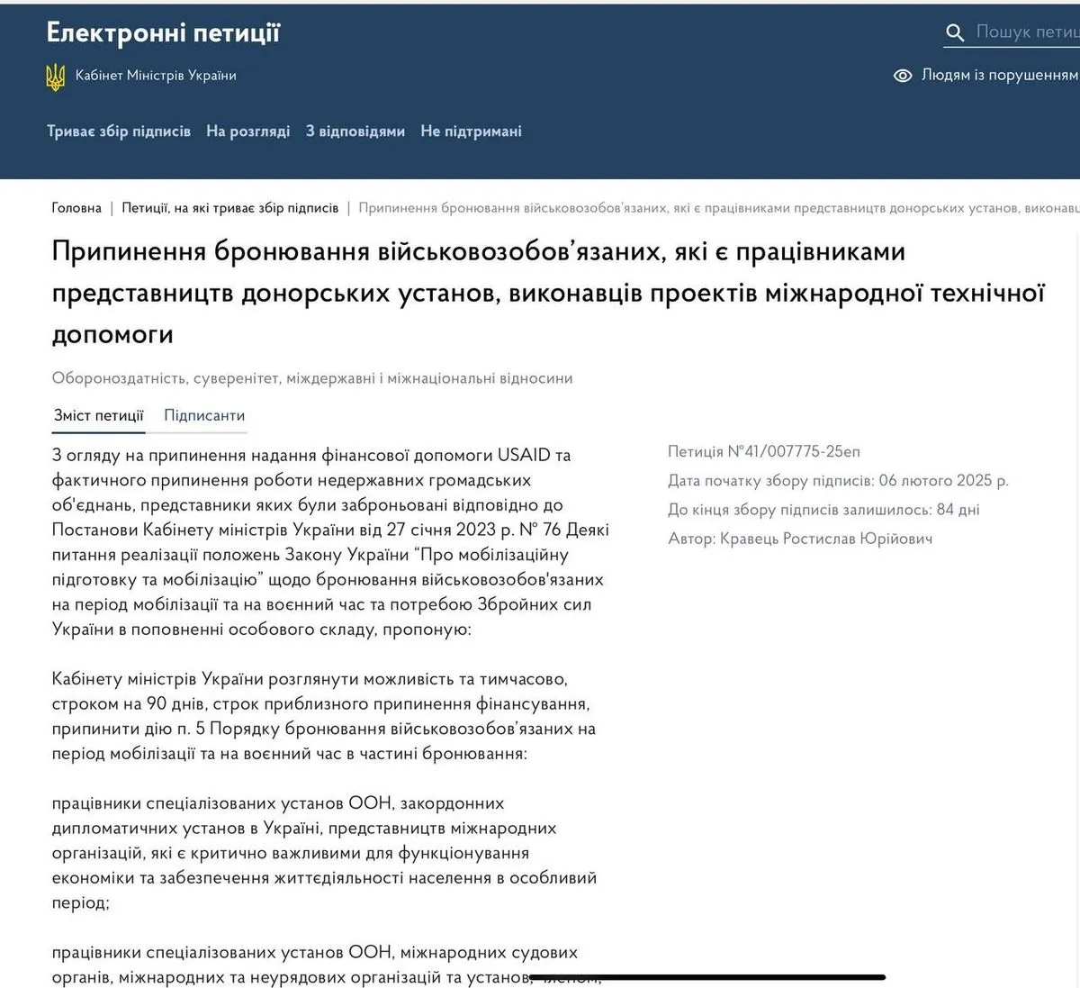 На сайті КМУ зареєстрована петиція щодо припинення бронювання військовозобов'язаних працівників донорських установ та проектів міжнародної допомоги. Юристи вказують на неефективність роботи цих організацій та необхідність аудиту використання коштів.