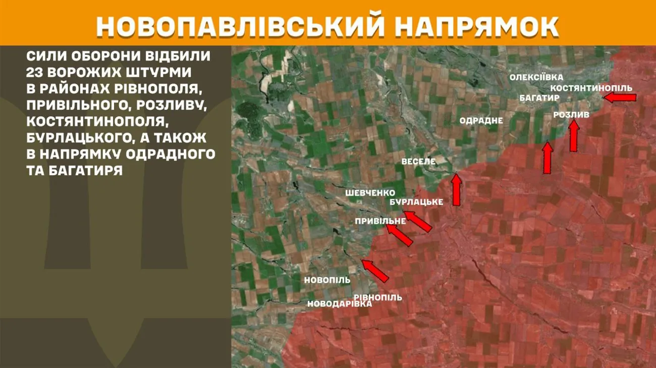 На Новопавлівському напрямку Сили оборони відбили 23 ворожих штурми в районах Рівнополя, Привільного, Розливу, Костянтинополя, Бурлацького, а також в напрямку Одрадного та Багатиря.