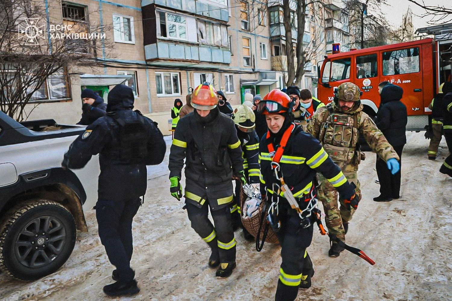 На місці удару працюють підрозділи ДСНС, співробітники Нацполіції, медики та комунальні служби. Від ДСНС залучено 65 рятувальників та 16 одиниць техніки, а також піротехнічний розрахунок та психологи.