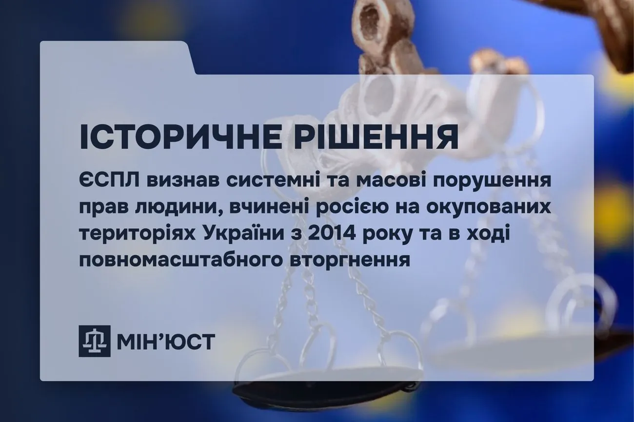 Європейський суд з прав людини визнав росію винною у системних та масових порушеннях прав людини на окупованих територіях України з 2014 року та під час повномасштабного вторгнення. Міністерство юстиції України назвало це рішення безпрецедентним та одним з найвагоміших у практиці міждержавних справ.