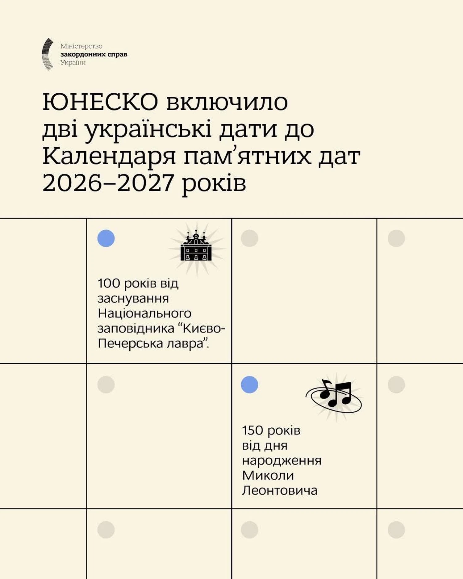 ЮНЕСКО додало до свого Календаря пам'ятних дат 2026–2027 років дві українські події. Це 100-річчя заснування заповідника "Києво-Печерська лавра" та 150-річчя від дня народження композитора Миколи Леонтовича.