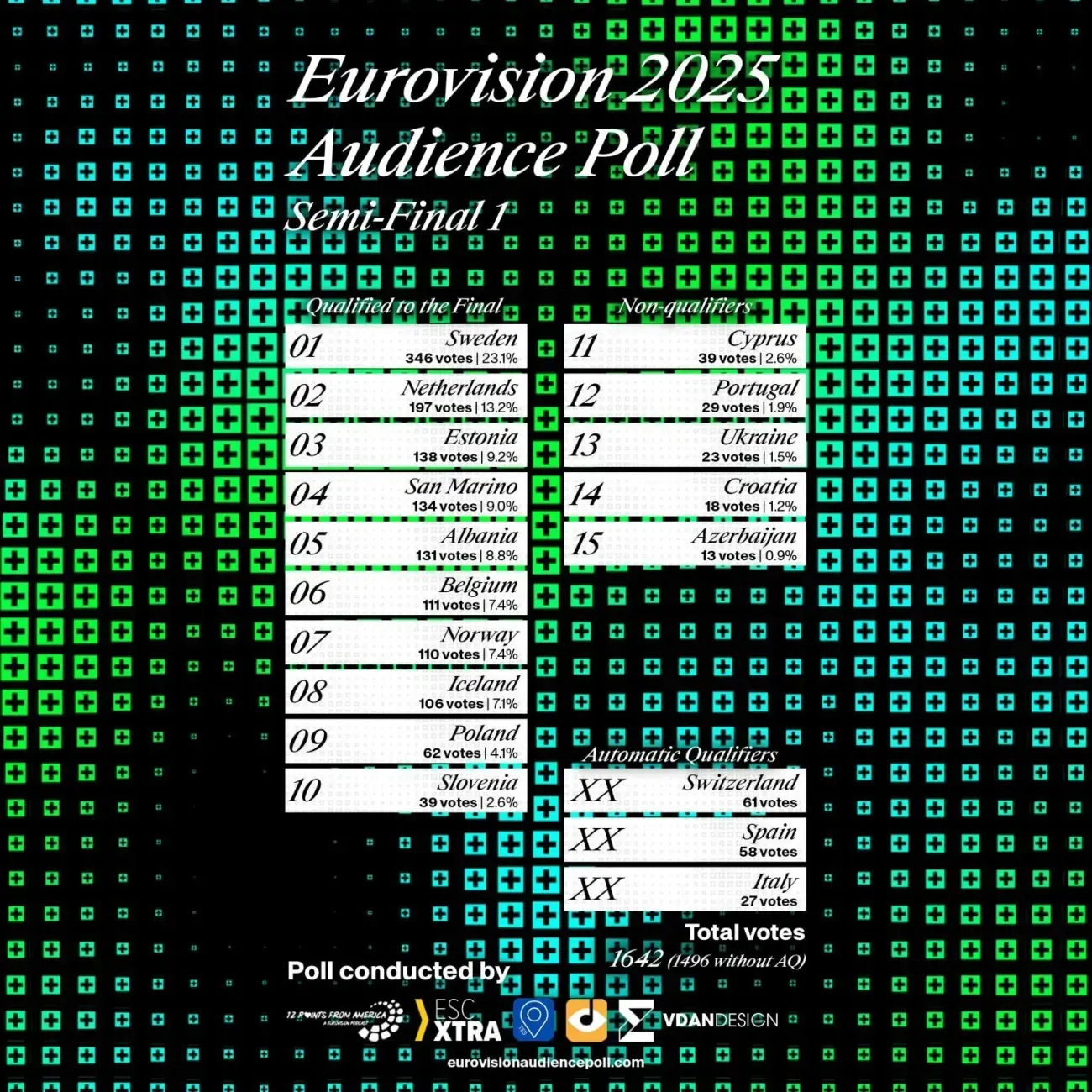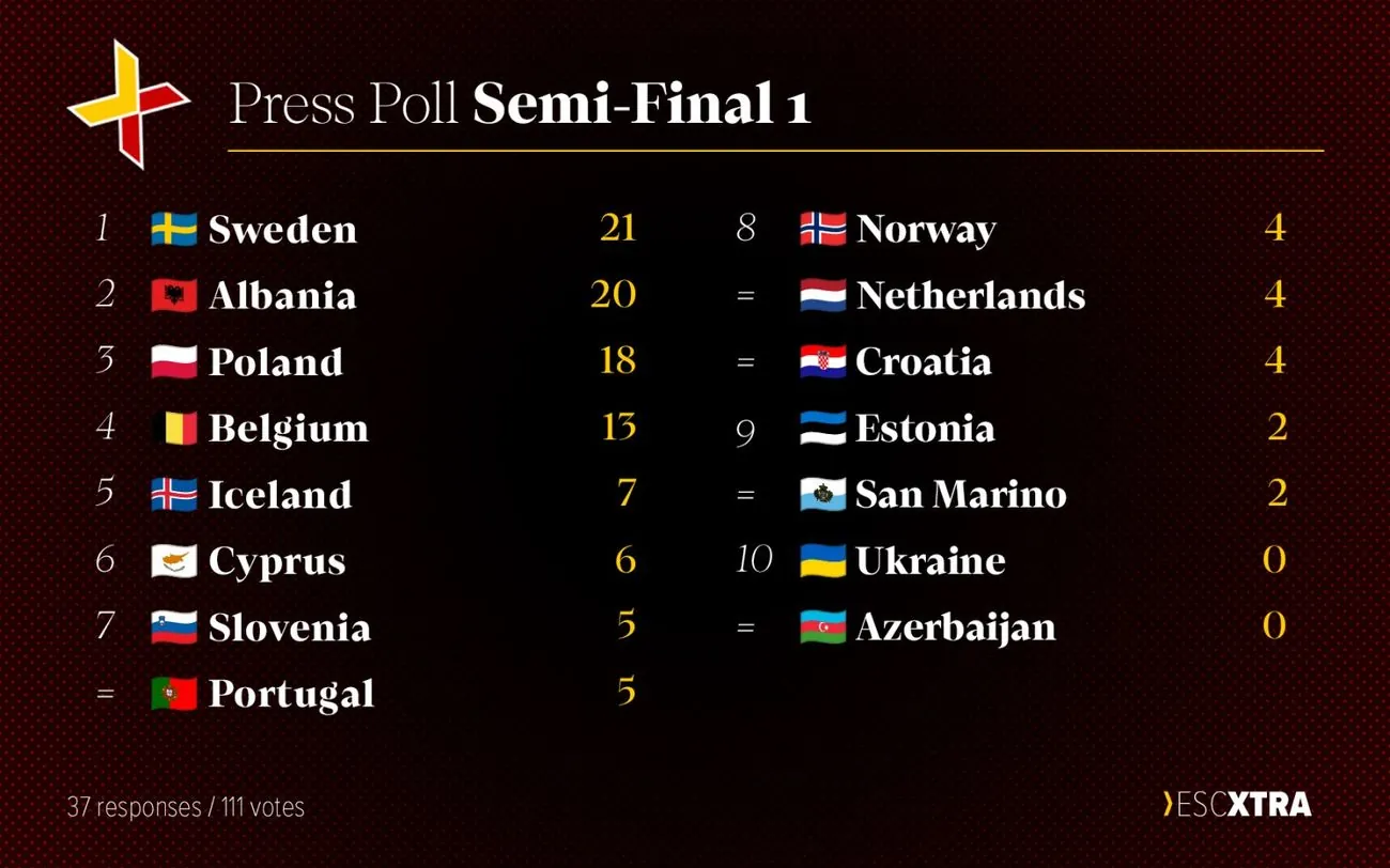 Сьогодні, 13 травня, у швейцарському Базелі відбудеться перший півфінал пісенного конкурсу Євробачення 2025, де Україну представить гурт Ziferblat. Однак виступи артистів із різних країн вже мали змогу побачити акредитовані працівники преси та глядачі. Результати голосування з'явилися на сайті ESCXTRA.com, пише УНН.