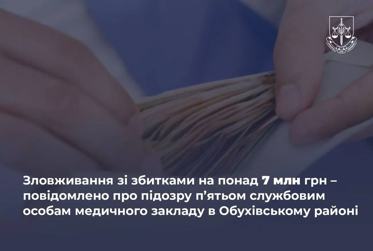 Колишньому директору медзакладу Обухівського району та чотирьом спільникам повідомлено підозру у зловживанні службовим становищем. Вони вносили недостовірні відомості про надані медичні послуги, що призвело до безпідставного нарахування понад 7 млн грн.