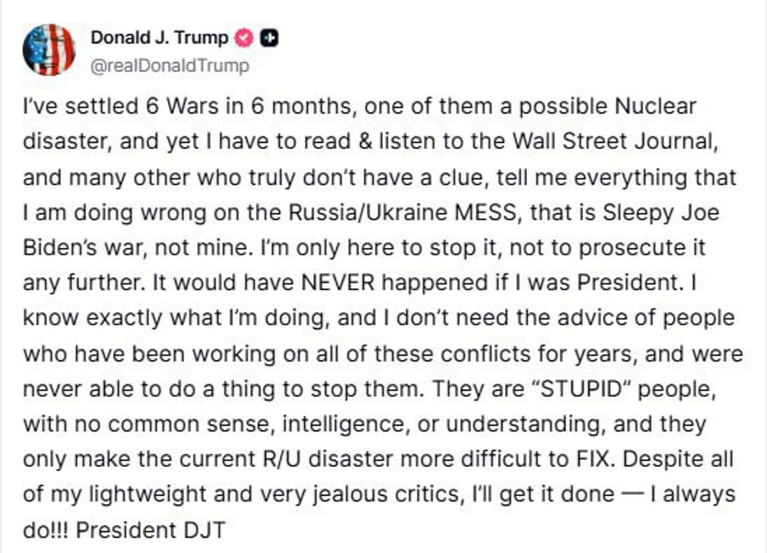 Трамп заявив, що він "врегулював 6 воєн за 6 місяців, одна з яких могла призвести до ядерної катастрофи". Він накинувся на критиків за те, що вони поставили під сумнів його дії у процесі врегулювання війни між Україною та росією.