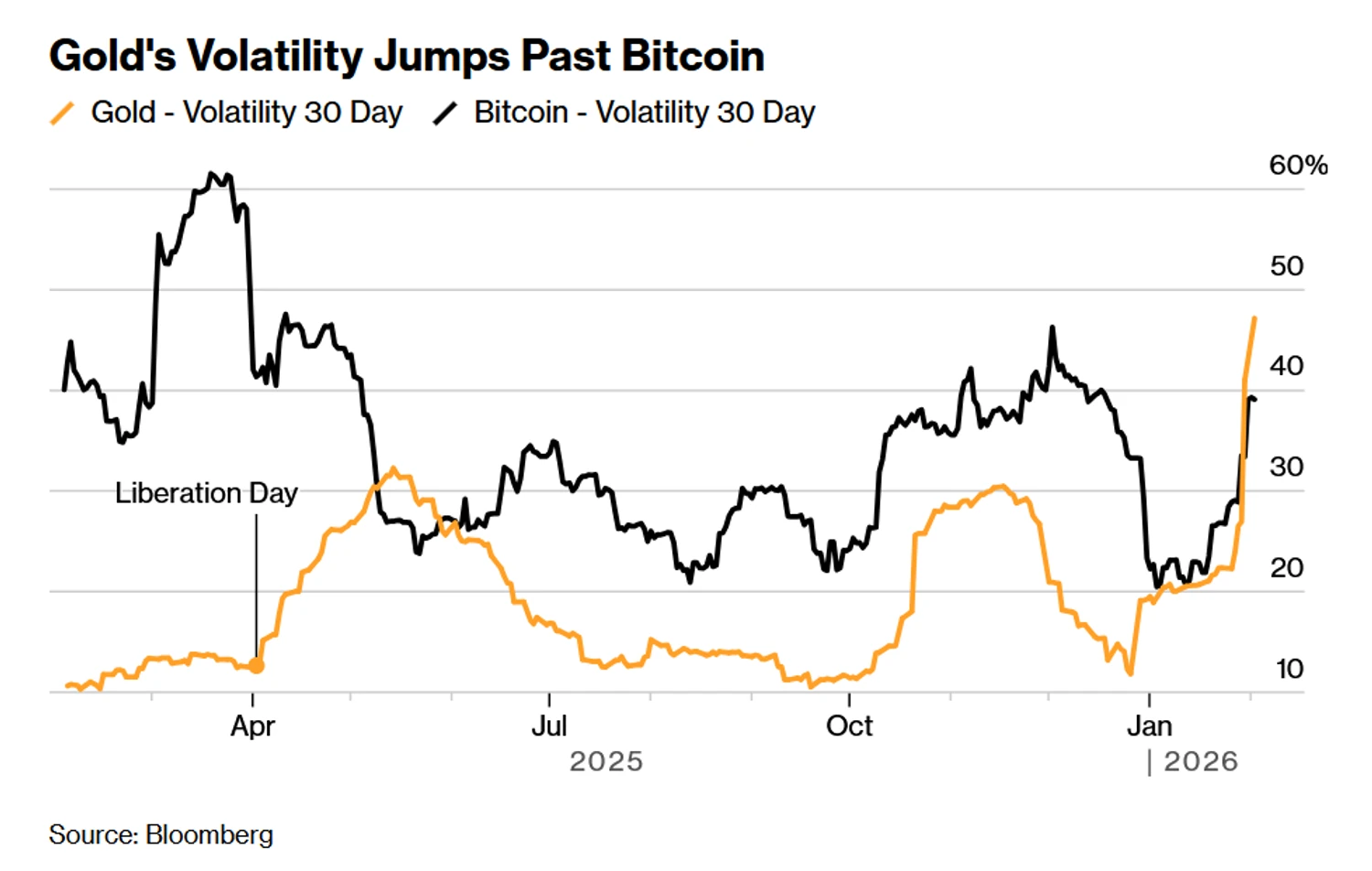 30-денна волатильність золота перевищила 44%, що є найвищим показником з 2008 року, перевершивши біткоїн. Це сталося після різкого падіння цін на золото на 10% та його ралі до рекордних максимумів.