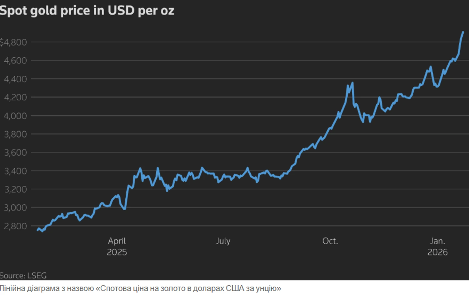 Світові ціни на дорогоцінні метали стрімко зростають на тлі геополітичної нестабільності. 22 січня золото перетнуло позначку 4917,65 доларів за унцію, а срібло та платина також оновили рекорди.