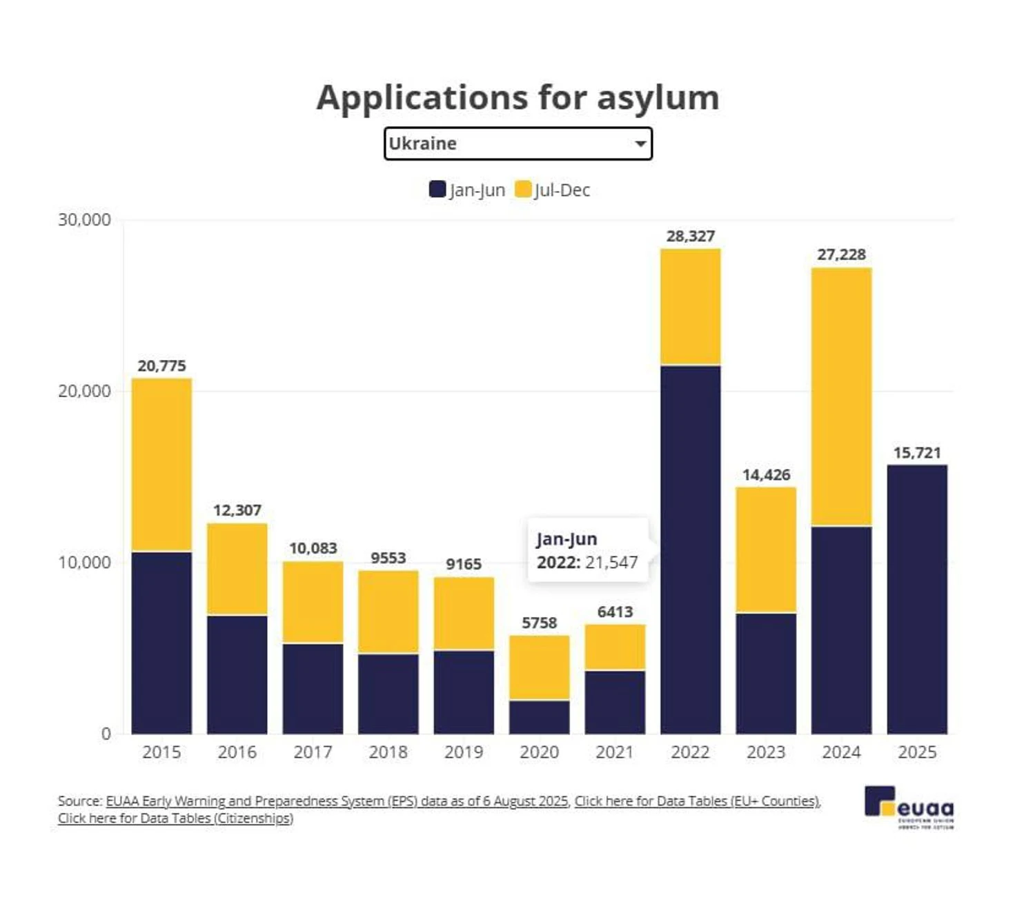 Зазначається, що за перше півріччя 2025 року кількість заяв на притулок від громадян України в країнах ЄС та Швейцарії зросла на 29% і склала 16 тисяч, свідчить звіт Агентства ЄС з питань надання притулку (EUAA).