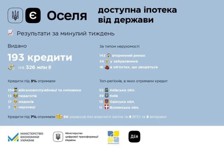 По данным Министерства экономики Украины на прошлой неделе 193 украинца получили кредиты на жилье по программе льготной ипотеки еОселя. Об этом отчитались в пресс-службе Минэкономики, передает УНН.