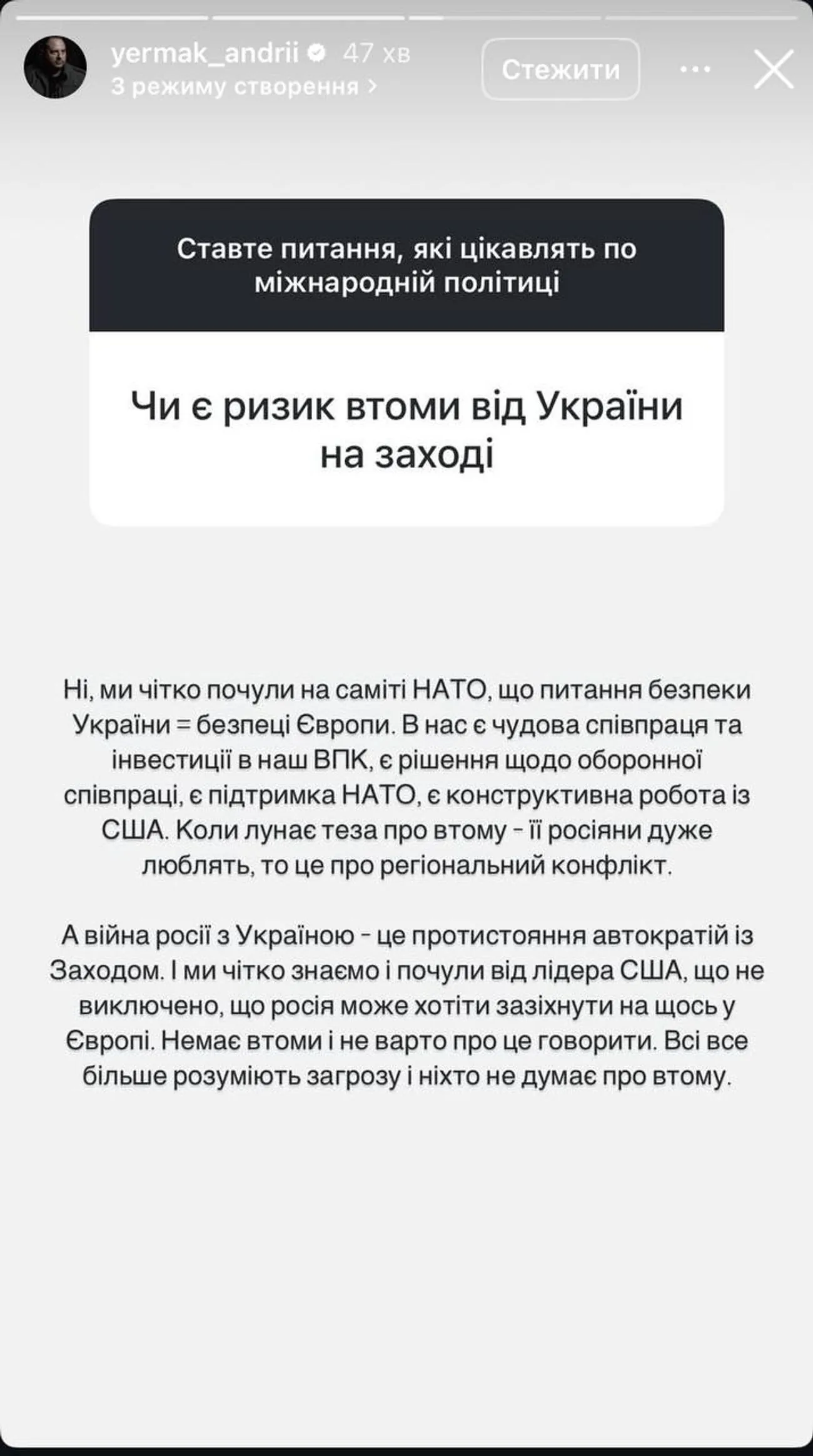 Руководитель Офиса Президента Андрей Ермак подчеркнул, что на саммите НАТО прозвучала четкая поддержка Украины как части общеевропейской безопасности. По его словам, разговоры об усталости от Украины на Западе выгодны россии, а Запад демонстрирует готовность к дальнейшей поддержке.