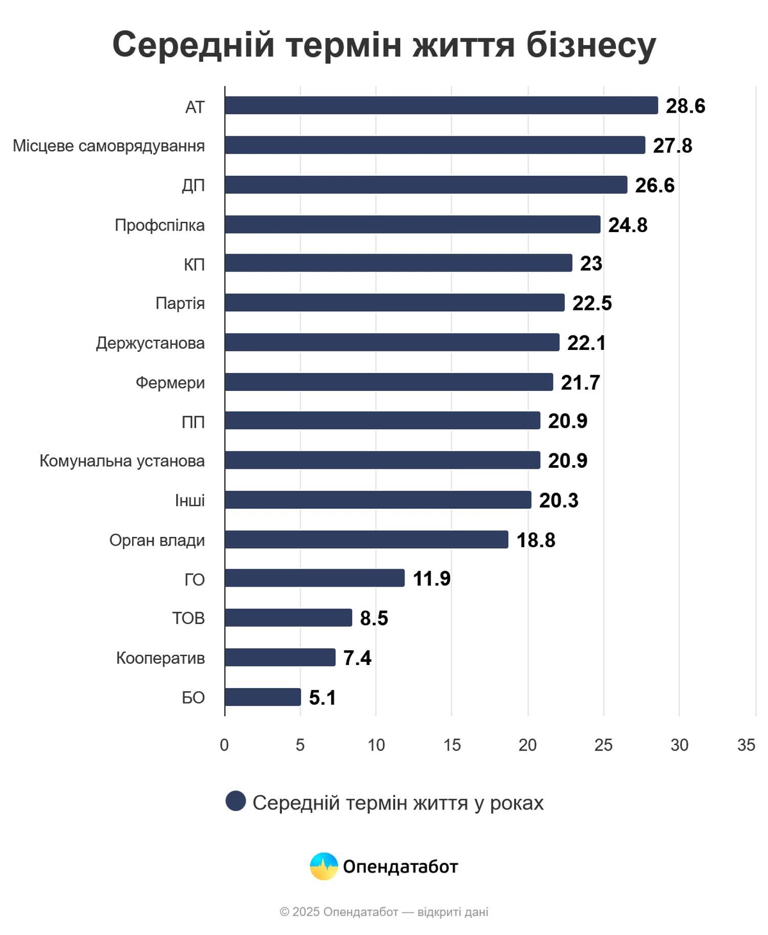Считая количественно, наиболее уязвимыми в этом году оказались общественные организации — 1 498 прекращений в этом году. Средний срок жизни ОО в Украине — 11 лет. Отметим, что ранее мы рассказывали о сложностях с отчетностью у таких компаний: собственно, в этом году 89% ОО не подали ежегодный финансовый отчет. Значительные потери наблюдаются и в оптовой торговле (1 001 компания), образовании (981), государственном управлении и обороне (966) и в сельском хозяйстве (794).