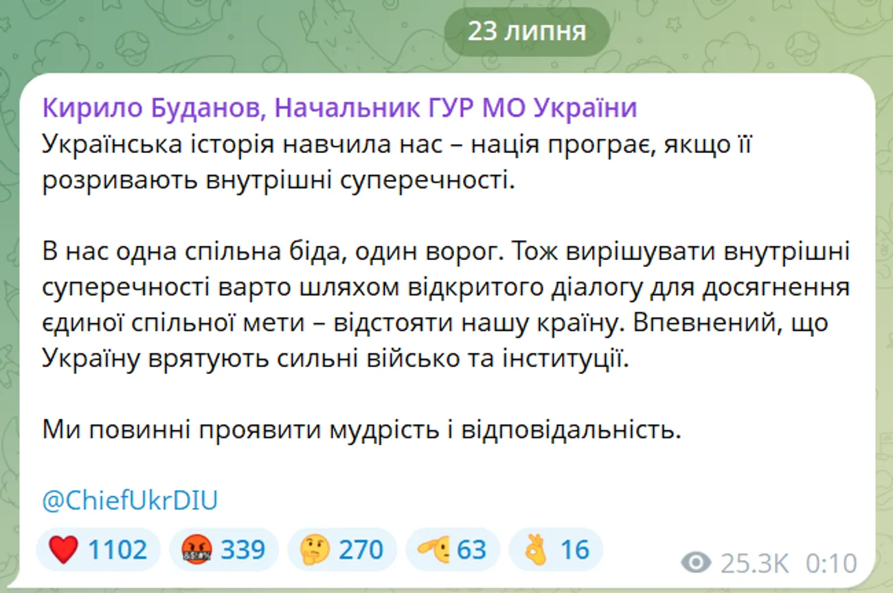 Начальник ГУР Кирилл Буданов прокомментировал подписание Президентом Зеленским закона №12414, регулирующего деятельность НАБУ и САП. Он подчеркнул, что Украину спасут сильные армия и институты, а внутренние противоречия следует решать открытым диалогом.