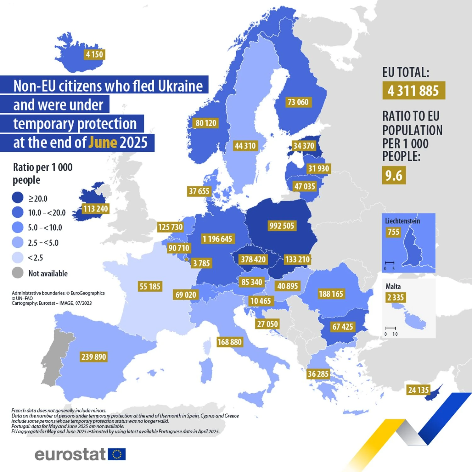 По данным Евростата, по состоянию на 30 июня 2025 года 4,31 миллиона граждан стран, не входящих в ЕС, которые бежали из Украины в результате российской агрессии против Украины, имели статус временной защиты в ЕС.