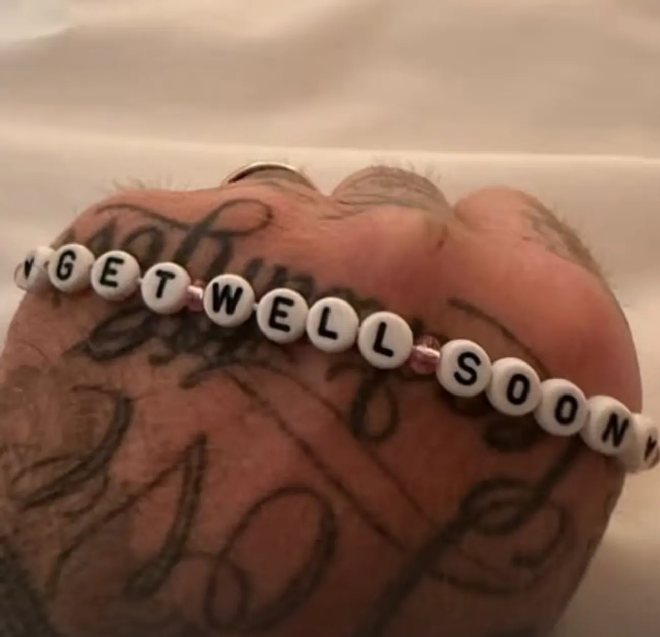 На втором фото изображена рука Дэвида с браслетом, на котором написано: "Скорейшего выздоровления".