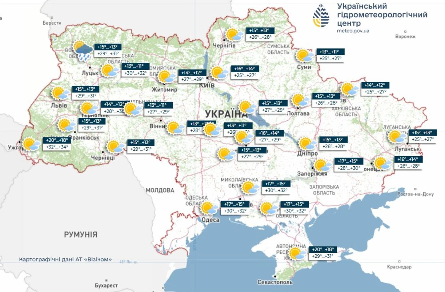 Ветер переменных направлений, 3-8 м/с. Температура днем 25-30°, в западных и южных областях 28-33°, на Закарпатье сильная жара 35°