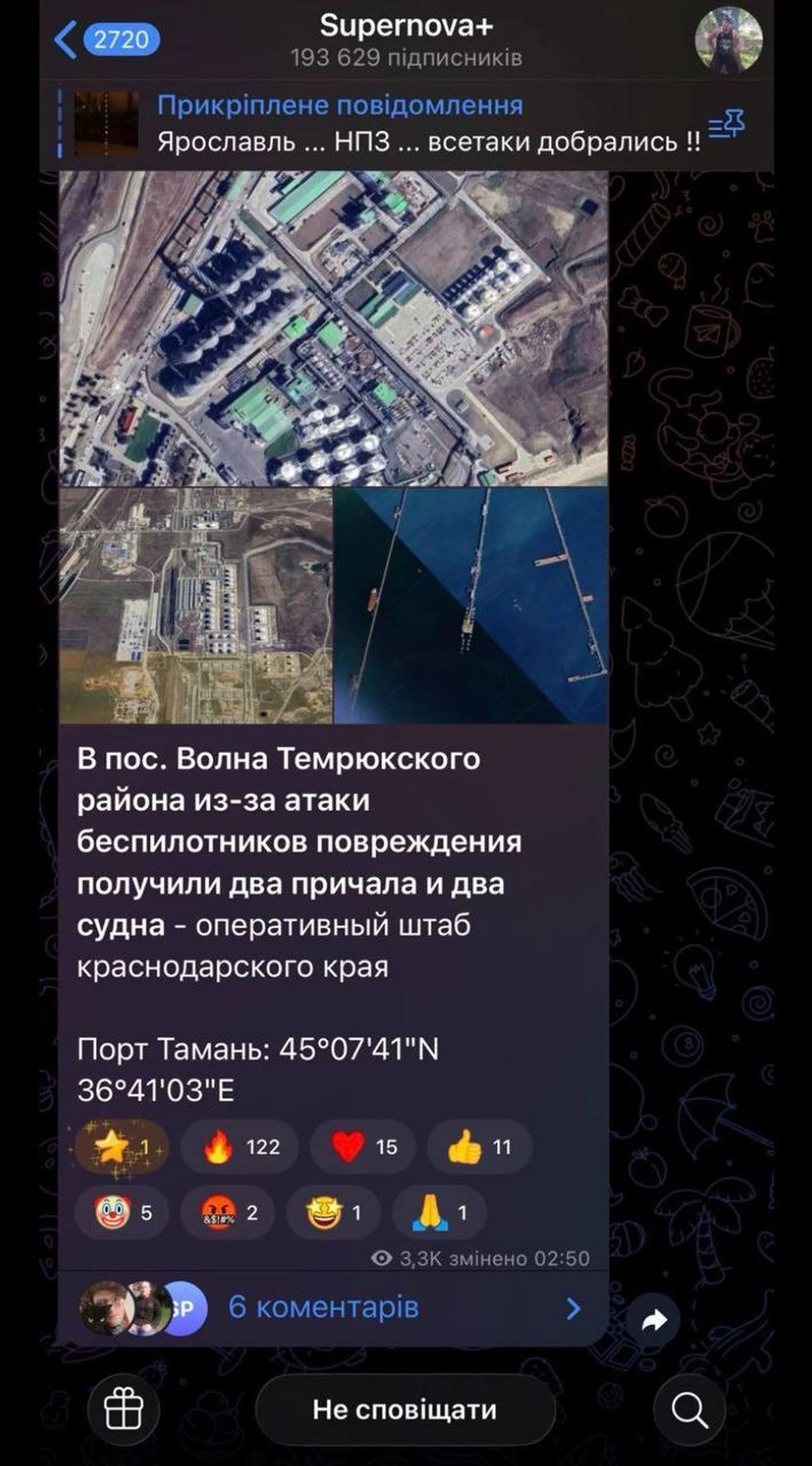 В ночь с 21 на 22 декабря 2025 года ударными БПЛА было совершено поражение морского нефтяного терминала "таманьнефтегаз" на территории краснодарского края рф. Об этом УНН сообщили источники в разведке.