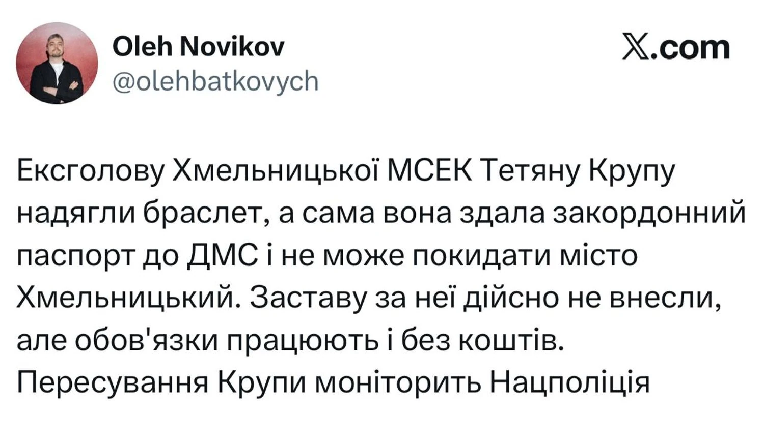 Экс-главе Хмельницкой МСЭК Татьяне Крупе надели браслет, а сама она сдала загранпаспорт в ГМС и не может покидать город Хмельницкий. Залог за нее действительно не внесли, но обязанности работают и без средств. Передвижение Крупы мониторит Нацполиция