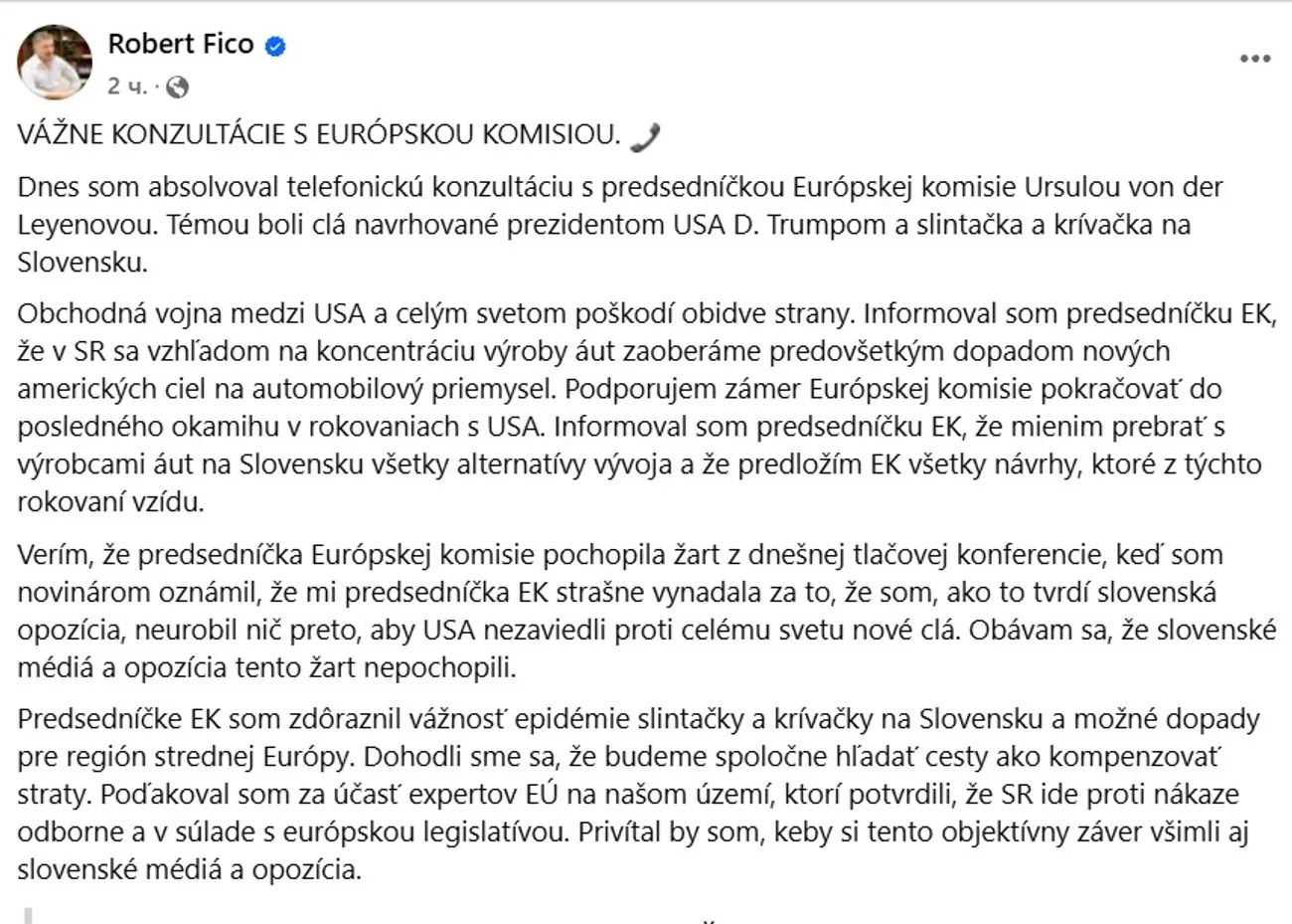 Премьер-министр Словакии Роберт Фицо сообщил о телефонном разговоре с президентом Еврокомиссии Урсулой фон дер Ляйен, признавшись, что получил от нее "выговор", и даже в эмоциональной атмосфере. Впоследствии в Facebook, Фицо объяснил что имел в виду по поводу этого разговора.