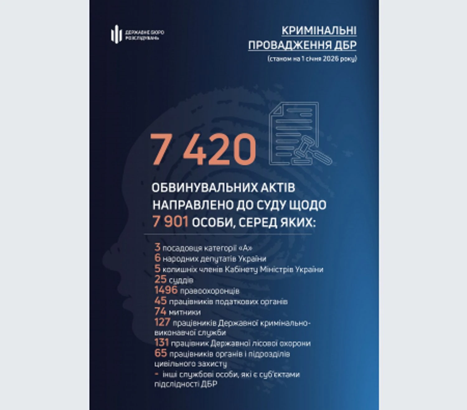 В 2025 году ГБР направило в суд более 7 тыс. обвинительных актов в отношении 7,9 тыс. человек. Среди них 6 народных депутатов, 5 бывших членов Кабмина и 1,5 тыс. правоохранителей.