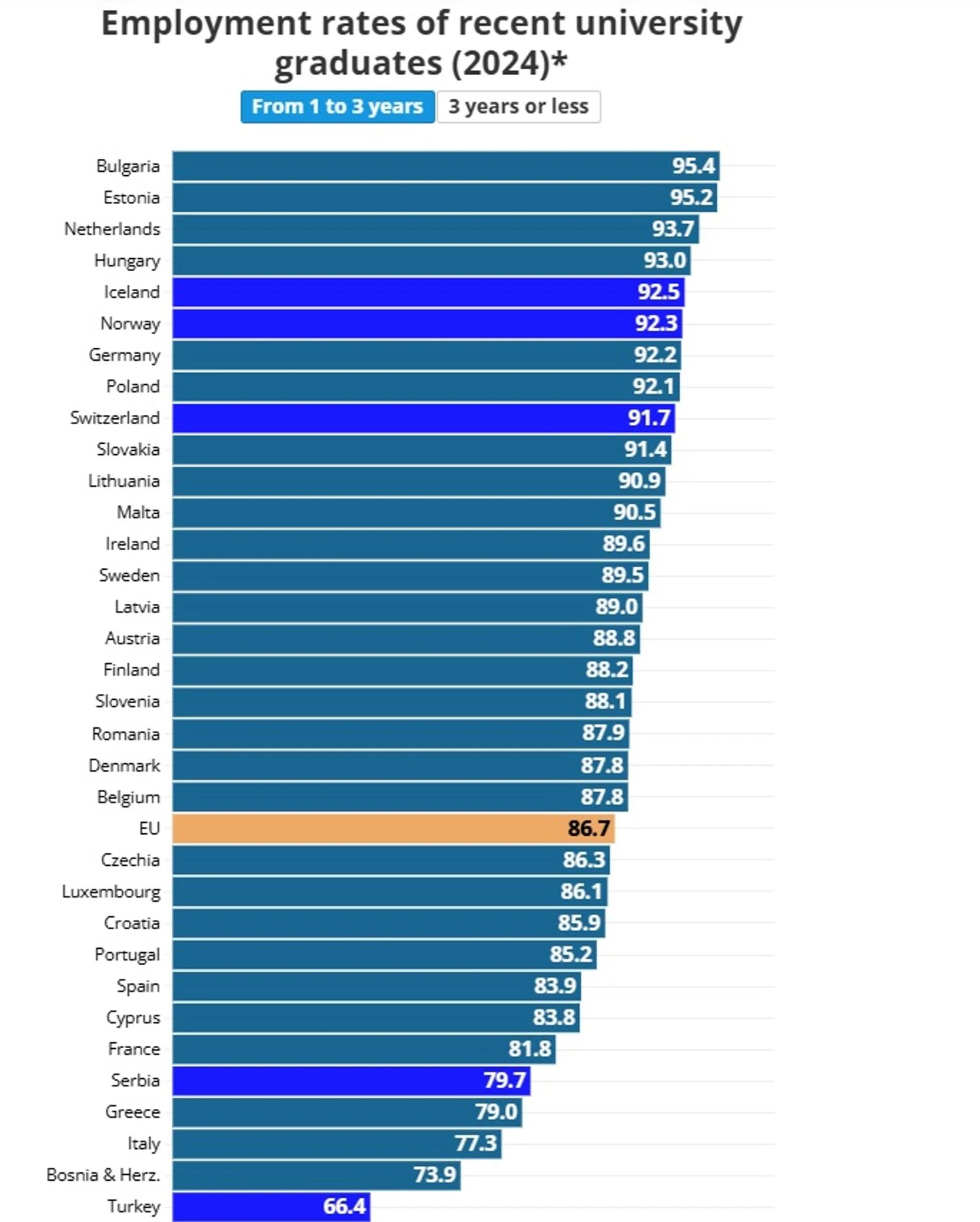 В целом в восьми странах Европы уровень занятости недавних выпускников высших учебных заведений превышает 90%. Среди них: Болгария (93,7%), Эстония (93,6%), Нидерланды (92,7%), Норвегия (92,3%), Исландия (92,0%), Германия (91,9%), Венгрия и Польша (по 90,5%).