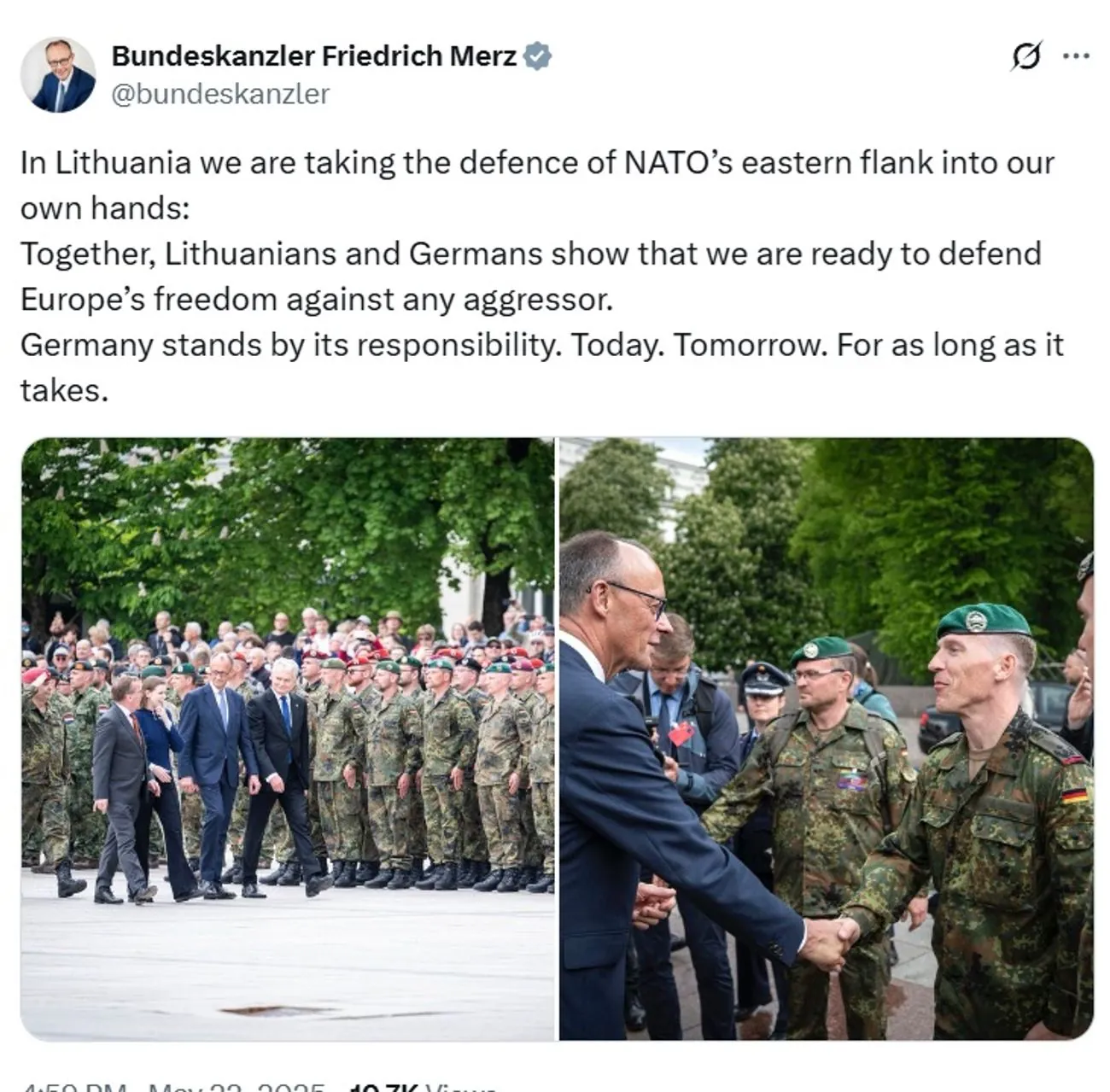 В Литве мы берем оборону восточного фланга НАТО в свои руки: вместе литовцы и немцы показывают, что мы готовы защищать свободу Европы от любого агрессора. Германия придерживается своей ответственности. Сегодня. Завтра. Столько, сколько нужно