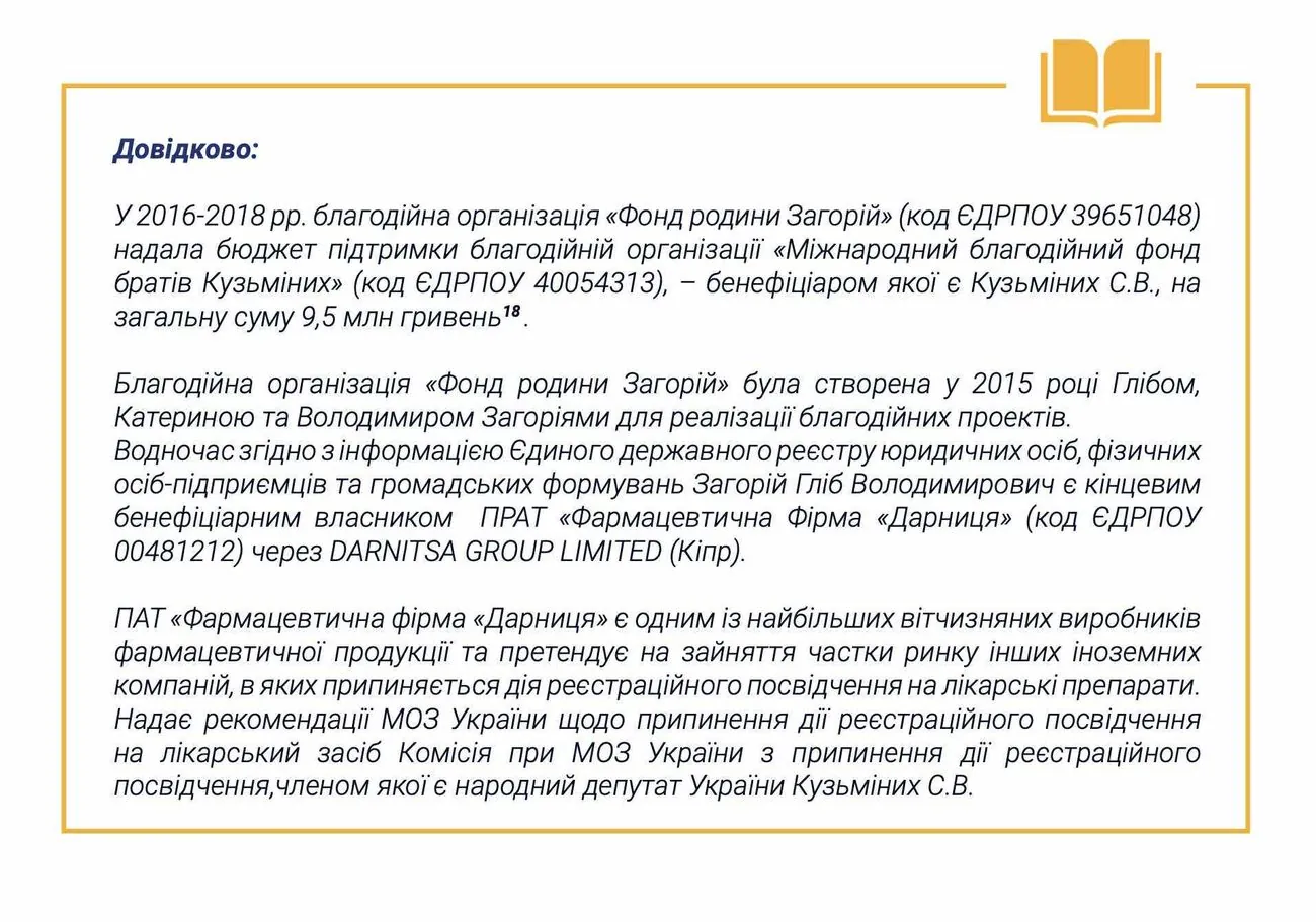 Еще до депутатства Сергей Кузьминых имел активные связи с фармацевтическими компаниями. В частности, благотворительная организация "Фонд семьи Загорий", основанная владельцами фармзавода "Дарница" Екатериной и Глебом Загориями, в 2016–2018 годах предоставила более 9,5 млн грн фонду братьев Кузьминых. То есть еще до парламентской карьеры Кузьминых получал поддержку от представителей крупного фармбизнеса. На тот момент Кузьминых работал членом комиссии Министерства здравоохранения, которая занималась прекращением действия регистрационных удостоверений, и не трудно догадаться, с чем была связана такая щедрость семьи Загориев.