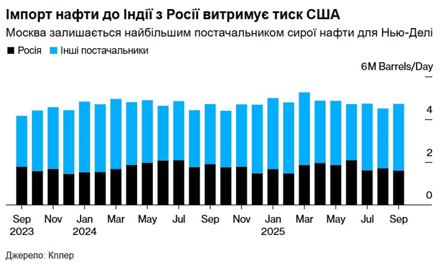 В сентябре поставки российской нефти в Индию уменьшились на фоне переговоров с США, однако она все еще составляет около трети общего импорта энергоносителей страны. По данным Kpler Ltd., объемы составили 1,61 млн баррелей в сутки, что меньше августовских 1,72 млн и на 16% ниже показателей прошлого года. Об этом сообщает Bloomberg, пишет УНН.
