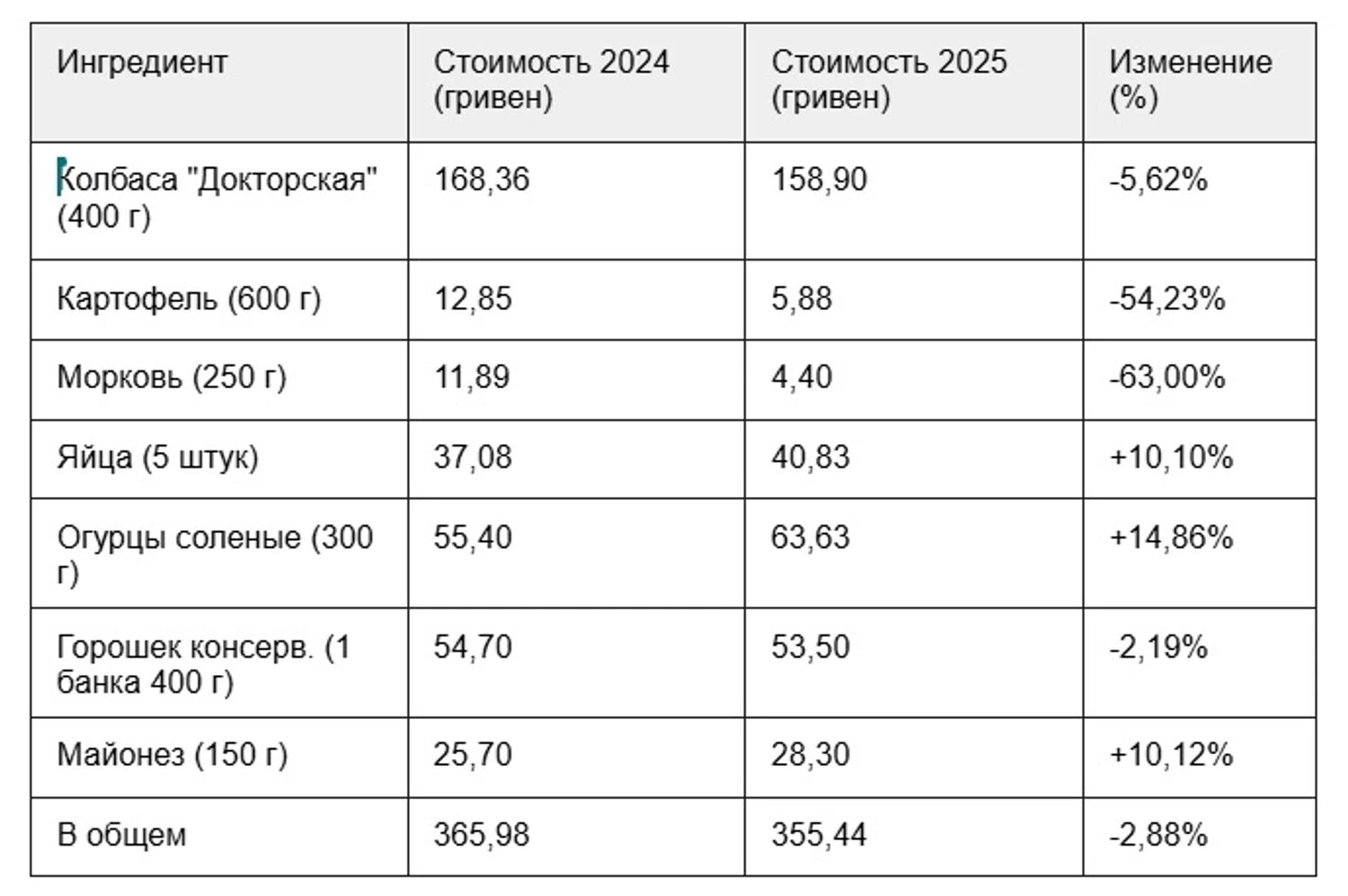 Стоимость оливье в 2025 году составила 355,44 гривны, что на 3% ниже, чем в 2024 году (365,98 гривны). Стоит отметить, что большинство ингредиентов снизилось в цене
