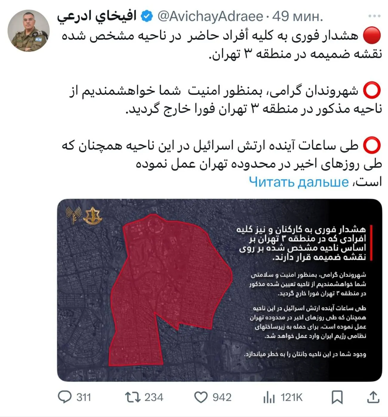 Армия обороны Израиля обратилась к жителям 3-го района Тегерана с беспрецедентным предупреждением об эвакуации. Министр обороны Израиля заявил, что эвакуация уже началась.