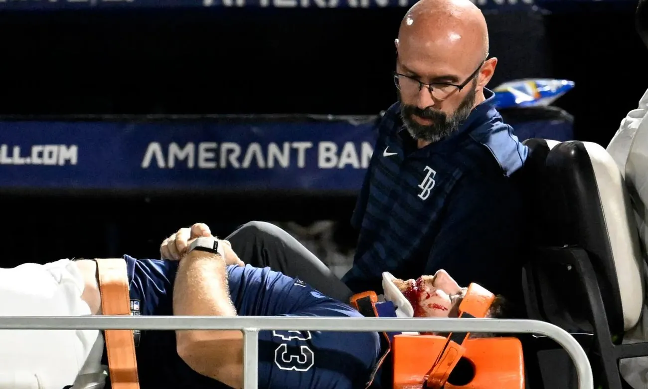 Питчер команды "Тампа-Бэй Рейс" Хантер Бигг получил травму, когда кетчер команды "Балтимор Ориолс" Эдли Рутчман бросил фол-бол в лаву запасных "Рейс" в четверг.
