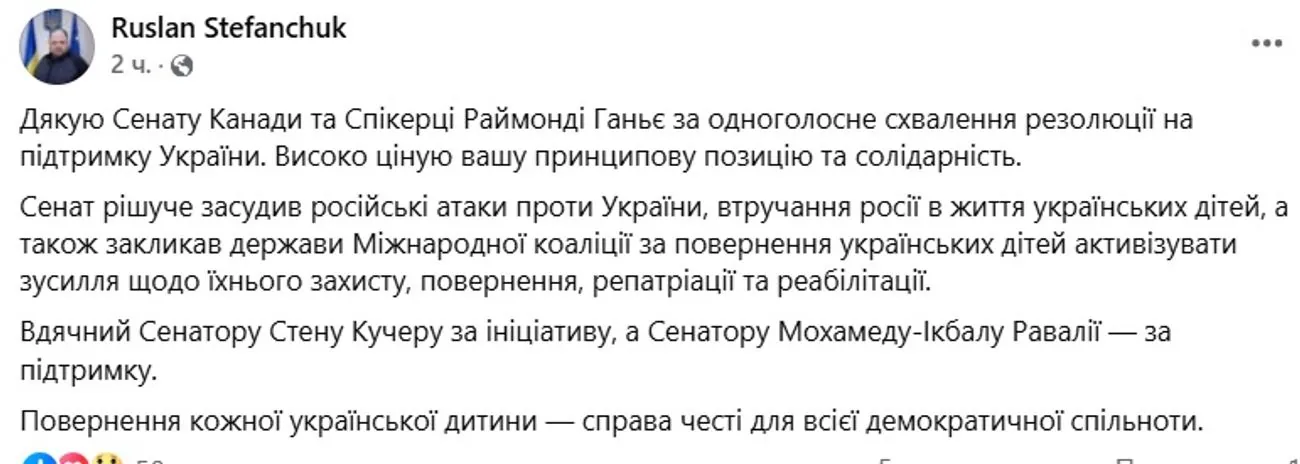 Передает УНН со ссылкой на страницу Senator Stan Kutcher в сети Х и Facebook-аккаунт Руслана Стефанчука, спикера ВР.