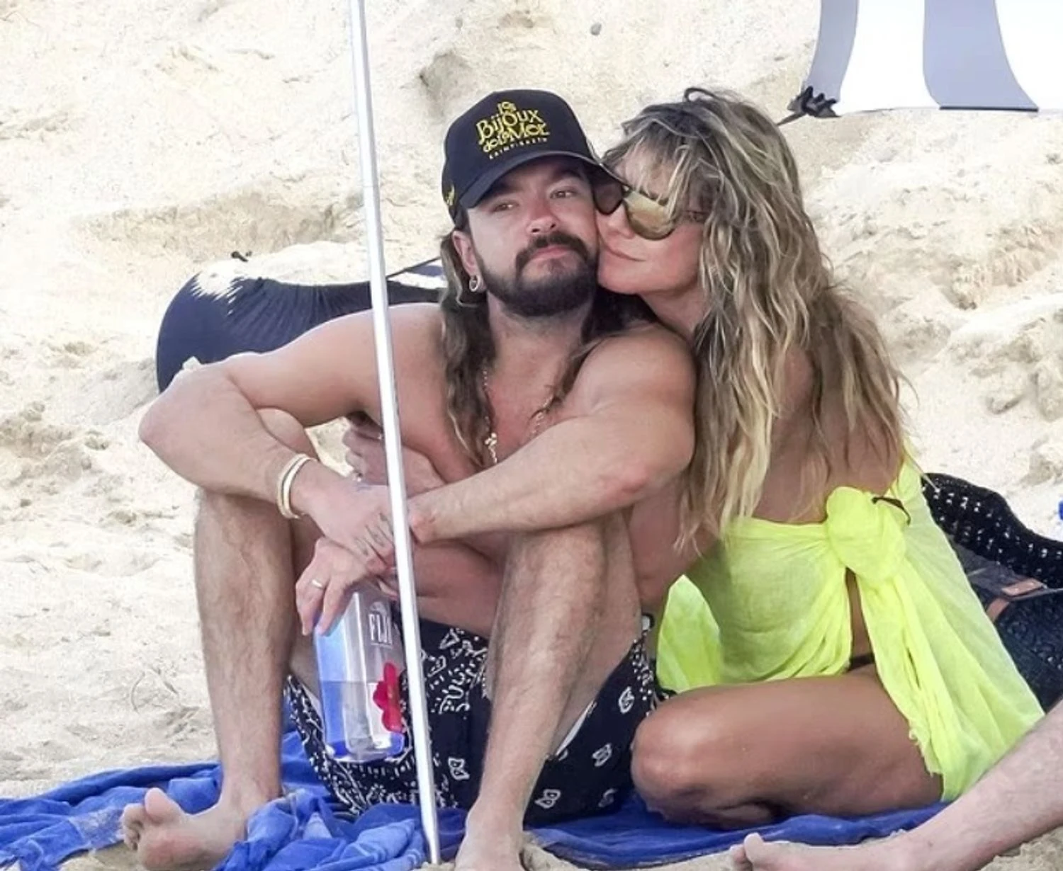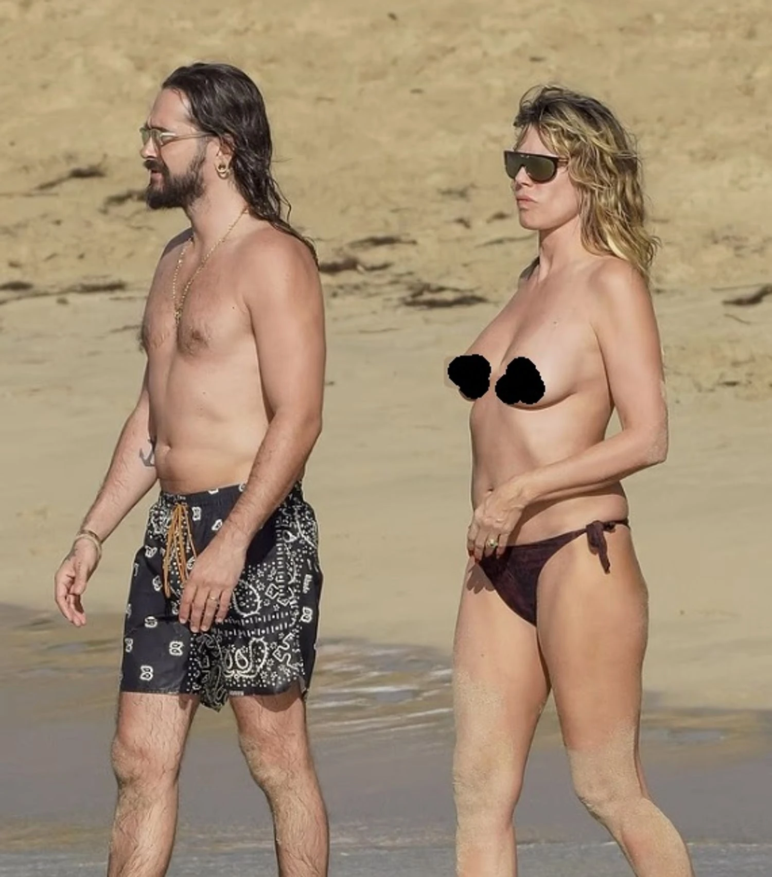 Супермодель прогуливалась по побережью только в коричневых плавках от бикини, продемонстрировав подтянутую фигуру. Пара не скрывала чувств: Клум и Каулитц много обнимались и целовались во время купания в океане. Хайди дополнила свой образ солнцезащитными очками и ярким красным маникюром, а при необходимости прикрывалась полупрозрачным салатовым топом.