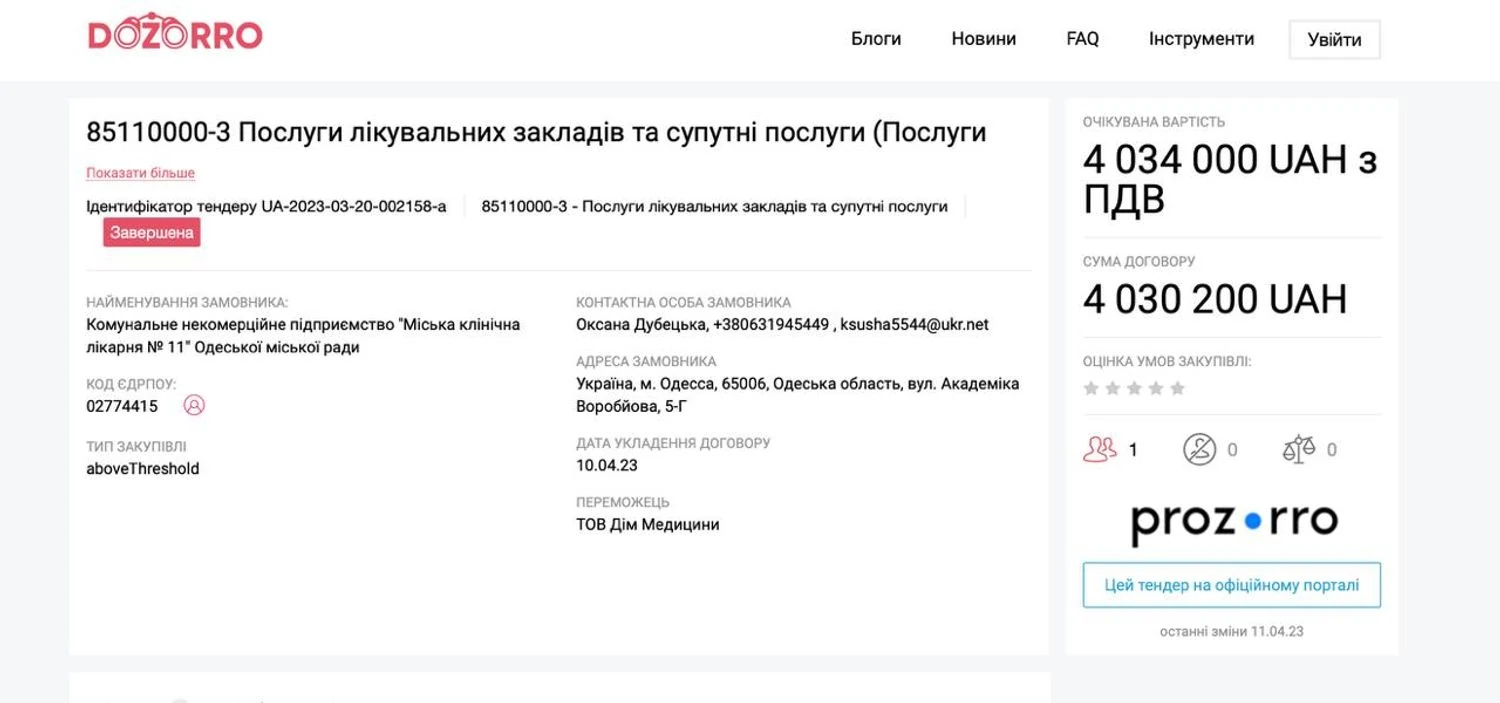 В определении Киевского районного суда г. Одессы указано, что в ходе досудебного расследования было установлено, что должностные лица коммунальной одесской больницы и ООО "Дом Медицины", которым руководил Тигран Арутюнян, заключили договор о закупке № МКЛ11-82/2023 от 10.04.2023.
