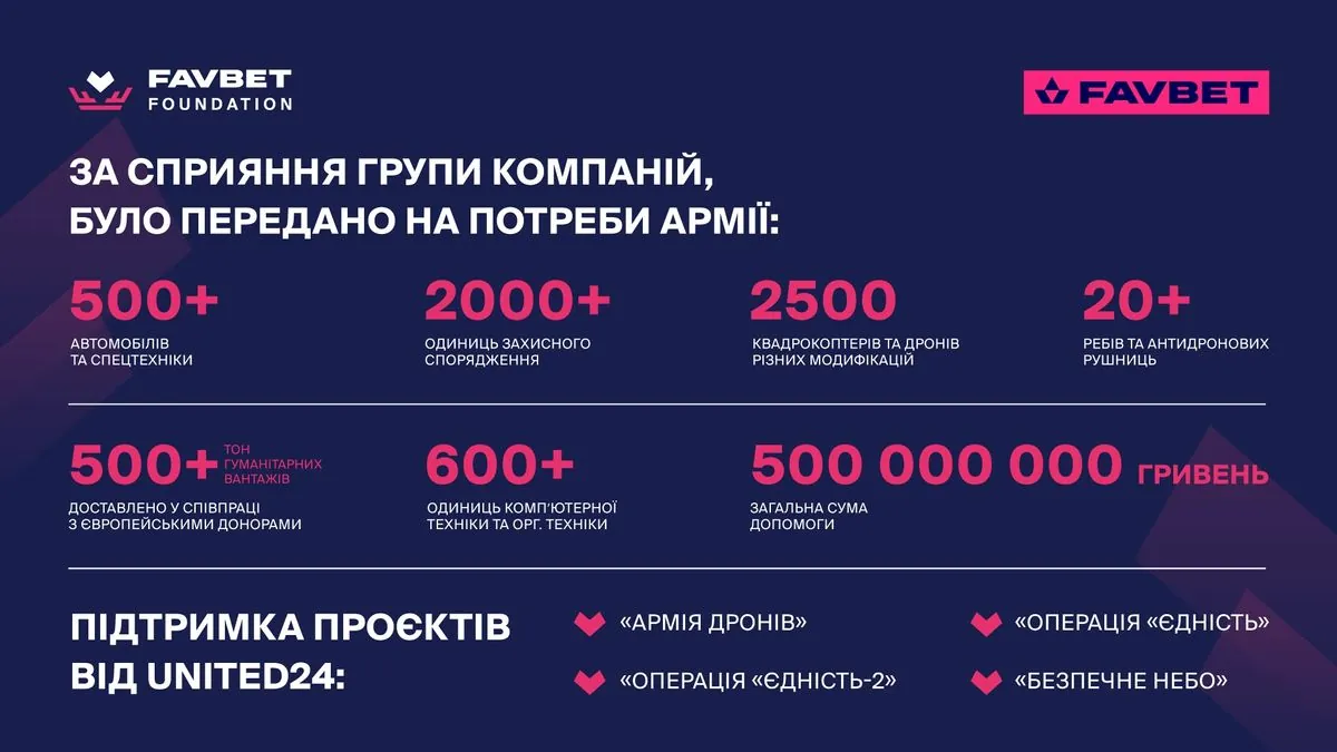 Отдельно стоит отметить сотрудничество с фандрайзинговой платформой UNITED24. За последние три года фонд и компания Favbet поддержали большинство ее ведущих проектов: от закупки пикапов для инициативы "Армия дронов" до приобретения беспилотников в рамках двух этапов операции "Единство".