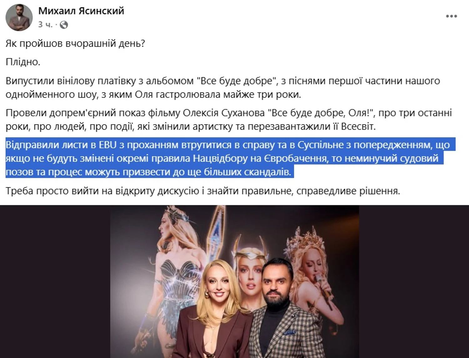 Продюсер Оли Поляковой Михаил Ясинский обратился в EBU и «Суспільне» с жалобой на изменение правил Нацотбора на Евровидение-2026. Команда певицы требует изменить отдельные правила, иначе угрожает судебным иском.