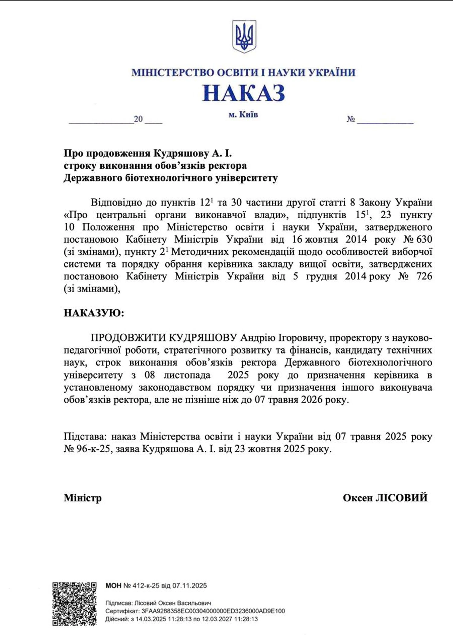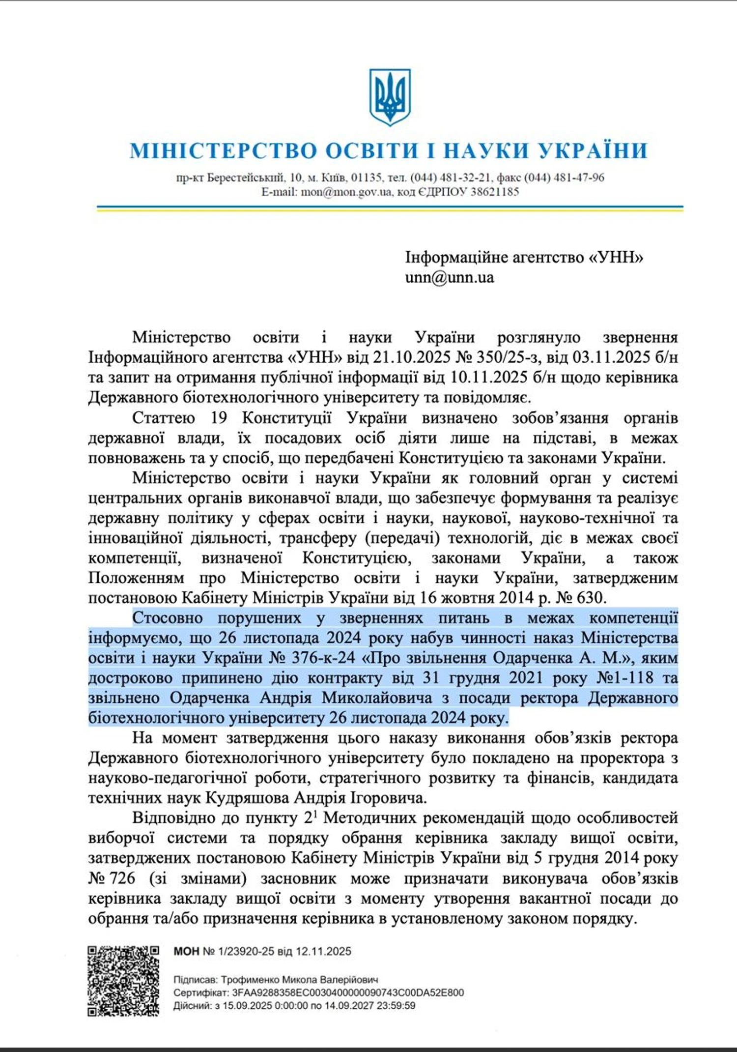 "Относительно затронутых в обращениях вопросов в пределах компетенции информируем, что 26 ноября 2024 года вступил в силу приказ Министерства образования и науки Украины № 376-к-24 "Об увольнении Одарченко А. М.", которым досрочно прекращено действие контракта от 31 декабря 2021 года №1-118 и уволен Одарченко Андрей Николаевич с должности ректора Государственного биотехнологического университета 26 ноября 2024 года", - говорится в ответе МОН.