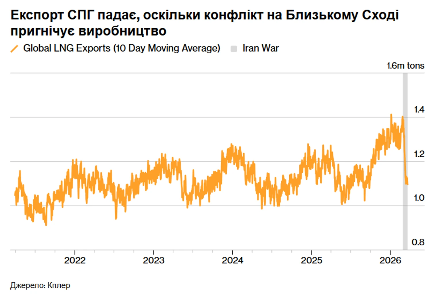 Мировые поставки сжиженного природного газа резко сократились на фоне эскалации конфликта на Ближнем Востоке. Объемы экспорта достигли самого низкого уровня за последние шесть месяцев. Об этом сообщает Bloomberg, пишет УНН.