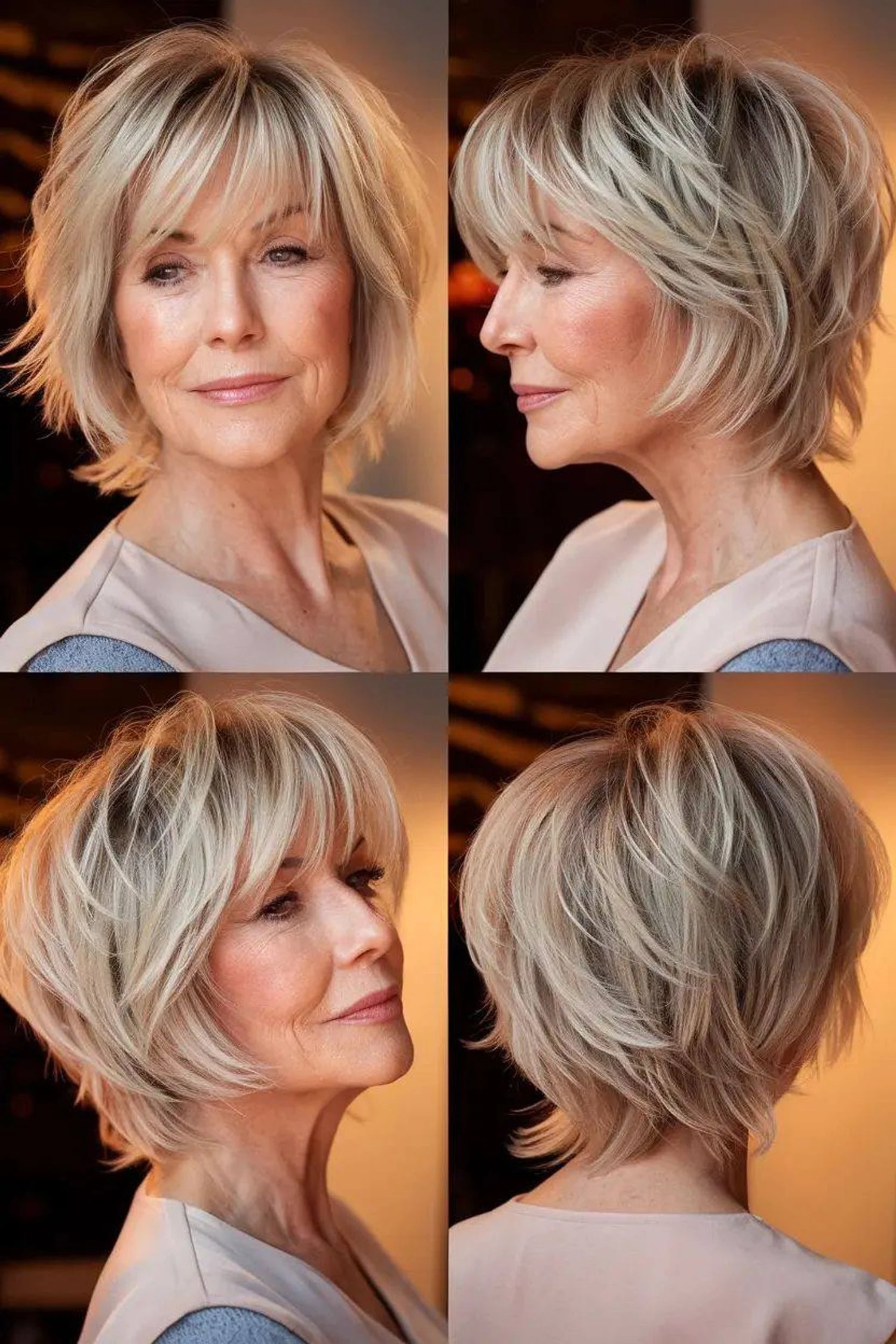 Слои - это еще один важный элемент коротких стрижек для женщин за 60. Они добавляют волосам объем, что особенно важно для тонких или редких волос. Слои делают прическу менее "тяжелой" и помогают подчеркнуть естественную текстуру волос. Короткий каскад или шегги со слоями выглядят живо и современно, а каре с легкими слоями добавляет игривости и объема на концах.