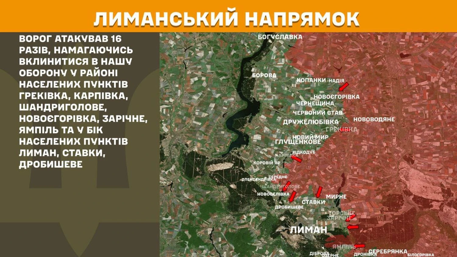 На Лиманском направлении враг атаковал 16 раз, пытаясь вклиниться в нашу оборону в районе населенных пунктов Грековка, Карповка, Шандриголово, Новоегоровка, Заречное, Ямполь и в сторону населенных пунктов Лиман, Ставки, Дробышево.