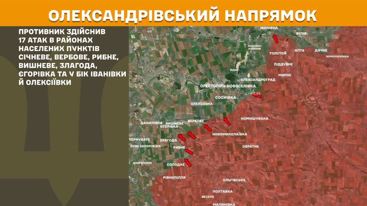 На Александровском направлении противник вчера совершил 17 атак в районах населенных пунктов Снежное, Вербовое, Рыбное, Вишневое, Злагода, Егоровка и в сторону Ивановки и Алексеевки.