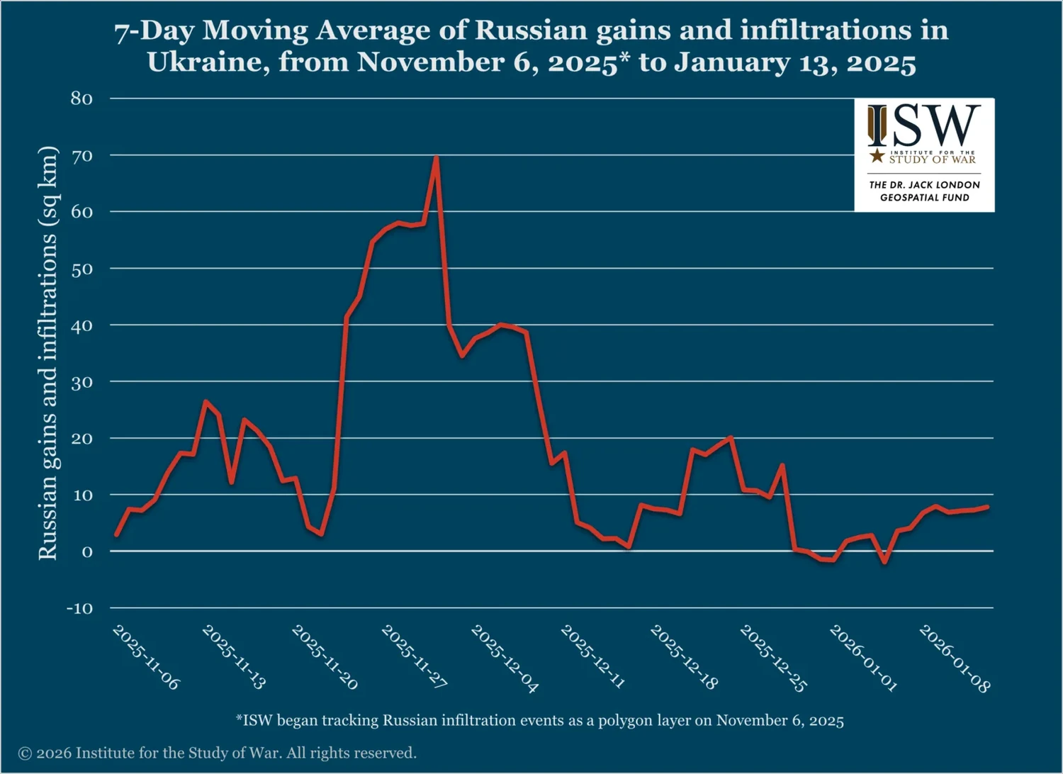 Продвижение россиян замедлилось в конце декабря 2025 года и в начале января 2026 года. Вероятно, причиной стали менее благоприятные погодные условия и прекращение усилий по соблюдению "произвольных сроков" в конце года.