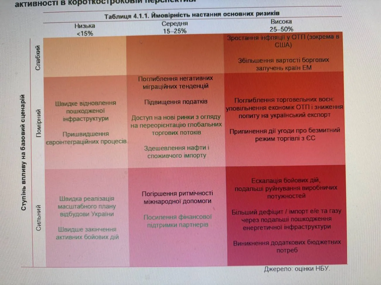 Продолжающаяся война генерирует риски дальнейшего снижения экономического потенциала, в частности из-за потерь людей, территорий и производств, что ограничивает возможности быстрого экономического роста. Военные риски для Украины также усиливаются ростом геополитической напряженности в мире.