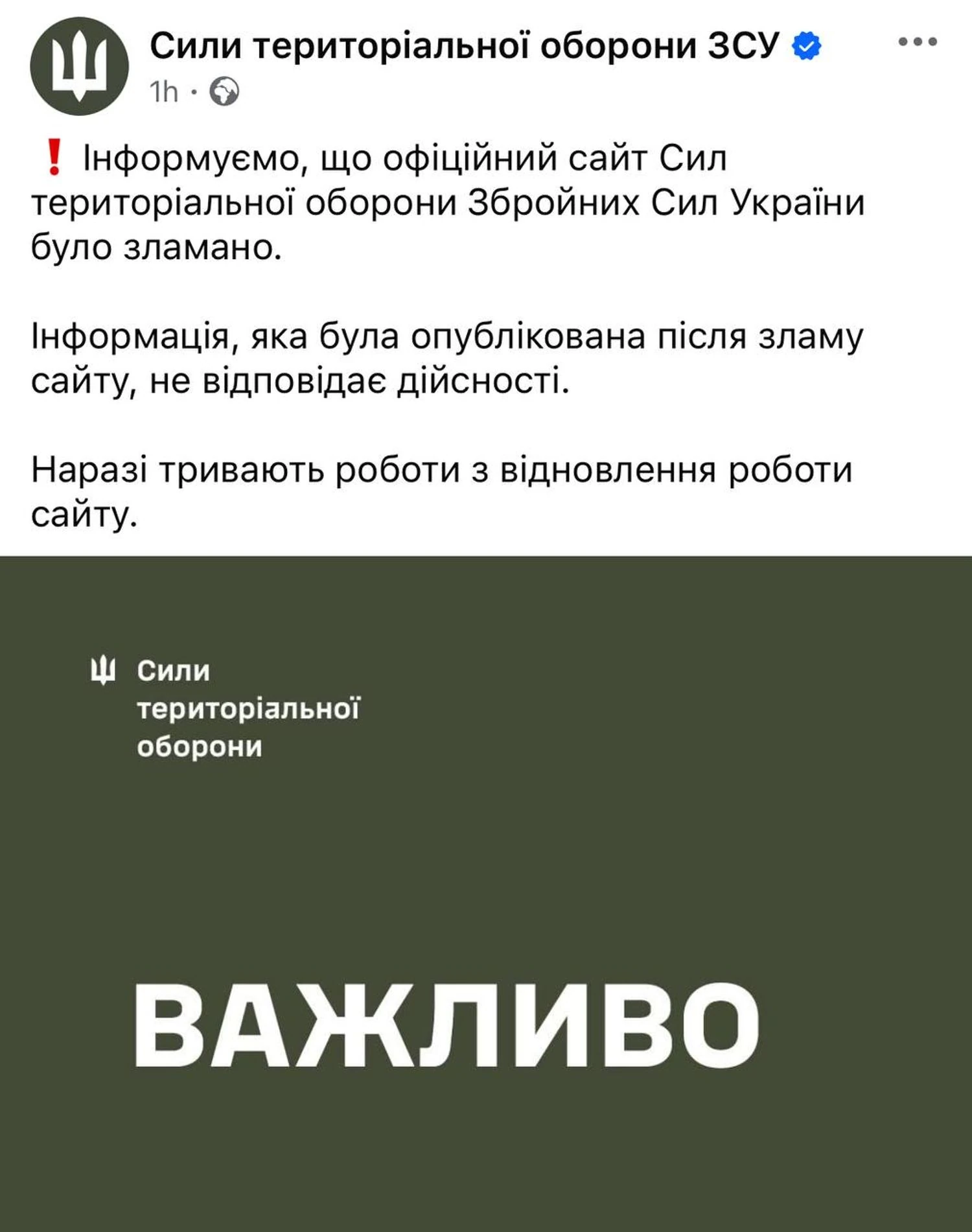 Информируем, что официальный сайт Сил территориальной обороны Вооруженных Сил Украины был взломан. Информация, которая была опубликована после взлома сайта, не соответствует действительности