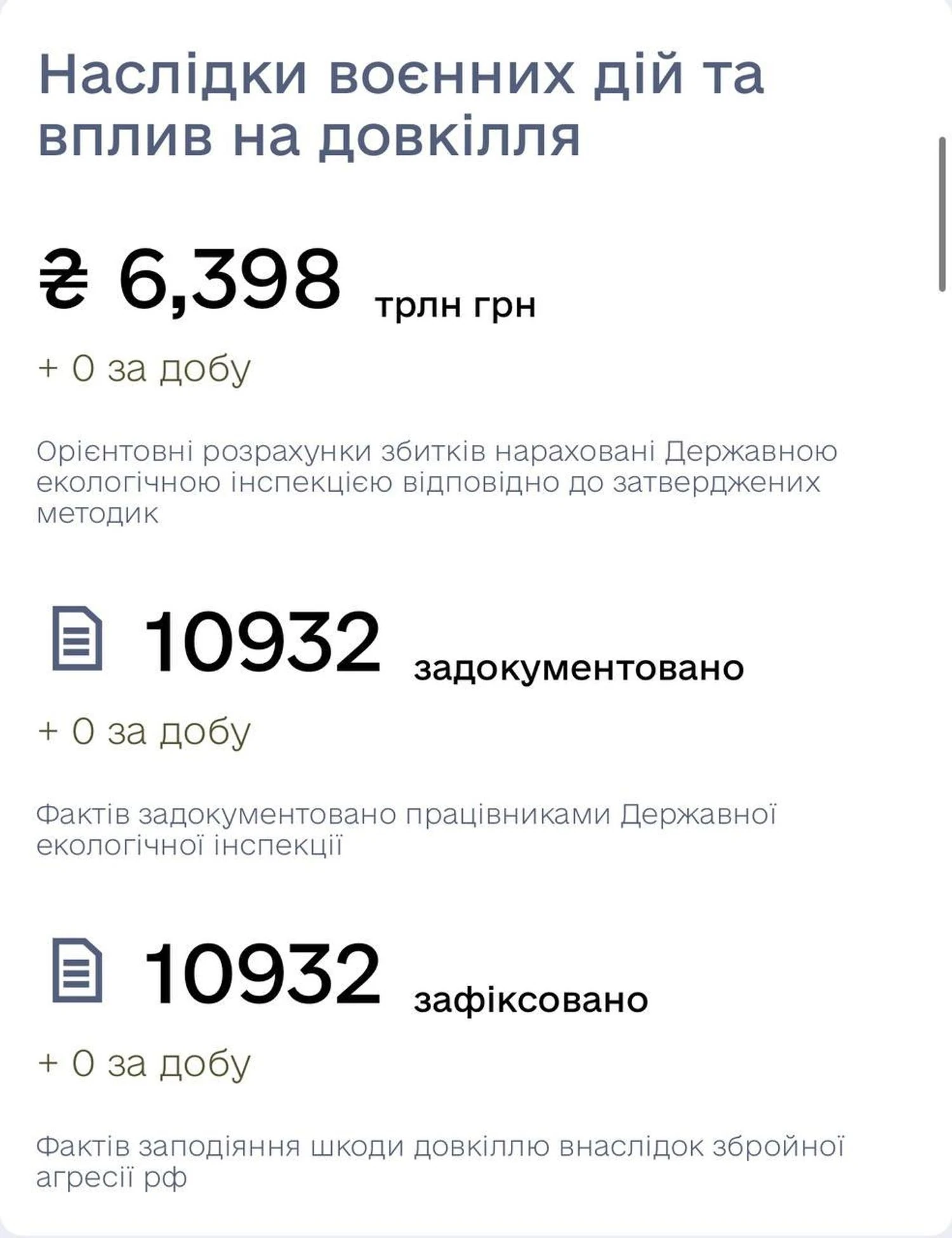 По информации министерства защиты окружающей среды и природных ресурсов, с начала полномасштабного вторжения РФ зафиксировано почти 11 тысяч фактов ущерба окружающей среде вследствие вооруженной агрессии. Кроме того, по подсчетам сотрудников Государственной экологической инспекции, сумма ущерба достигает триллионов гривен.