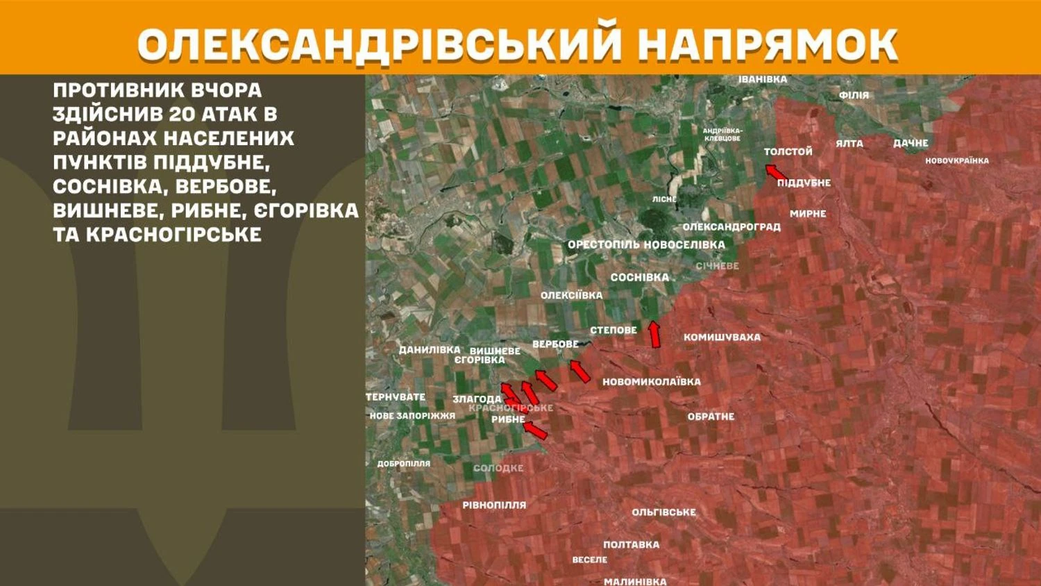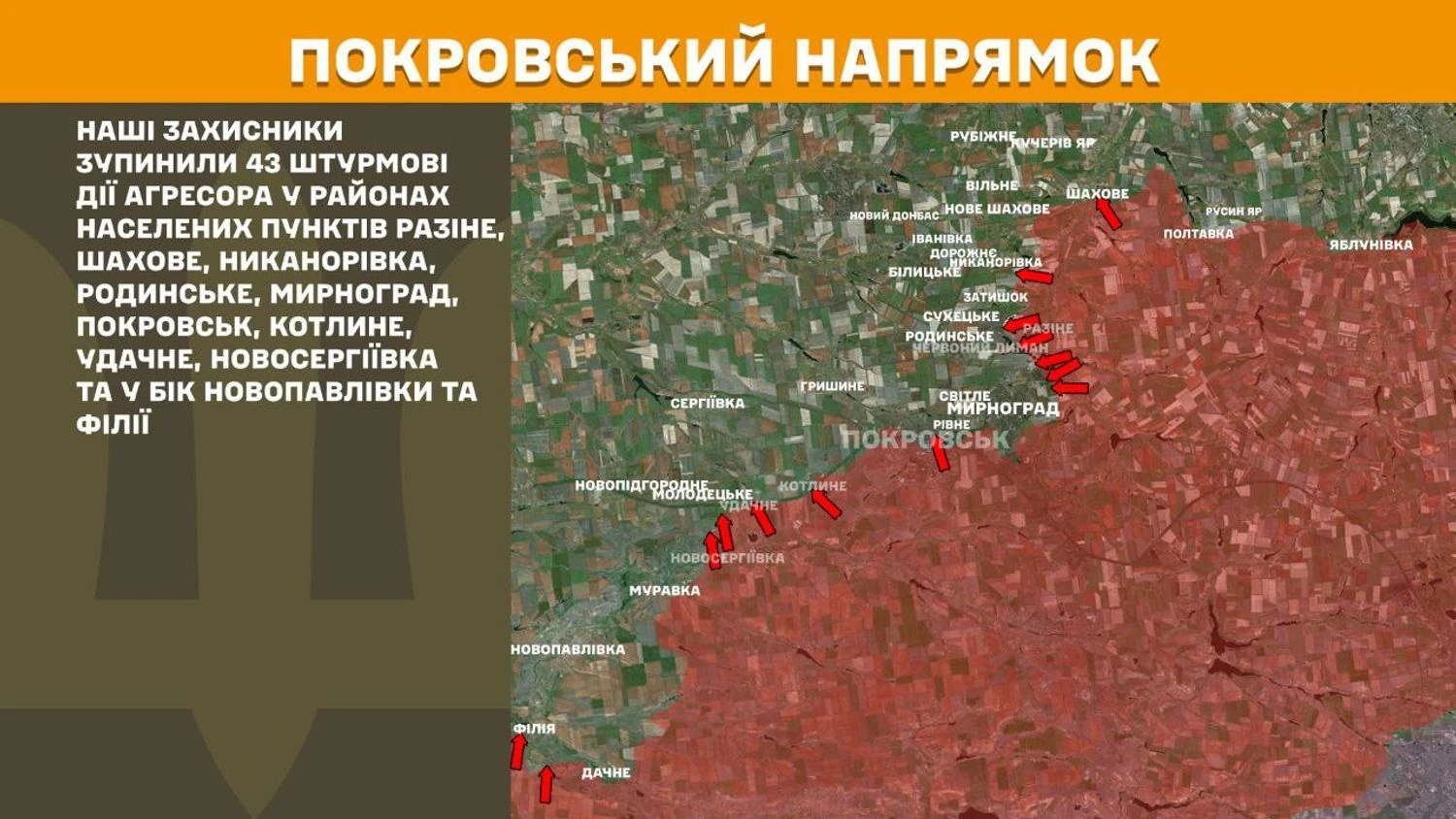 Наибольшая концентрация штурмовых действий врага наблюдается на Покровском направлении, где Силы обороны остановили 43 атаки в районах Покровска, Мирнограда и окрестных поселков. Также высокая интенсивность боев сохраняется на Гуляйпольском (27 атак), Константиновском и Александровском направлениях (по 20 атак на каждом).