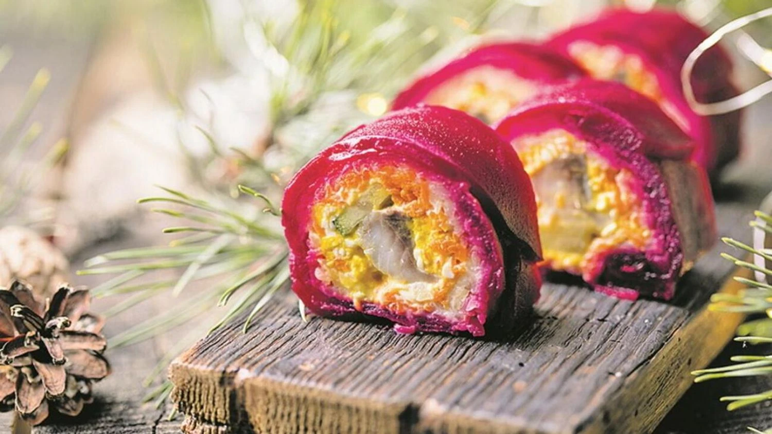 В варианте рулета ингредиенты выкладывают на пищевую пленку или лаваш, а затем сворачивают и охлаждают. После нарезки блюдо выглядит современнее, его удобно подавать порционно.