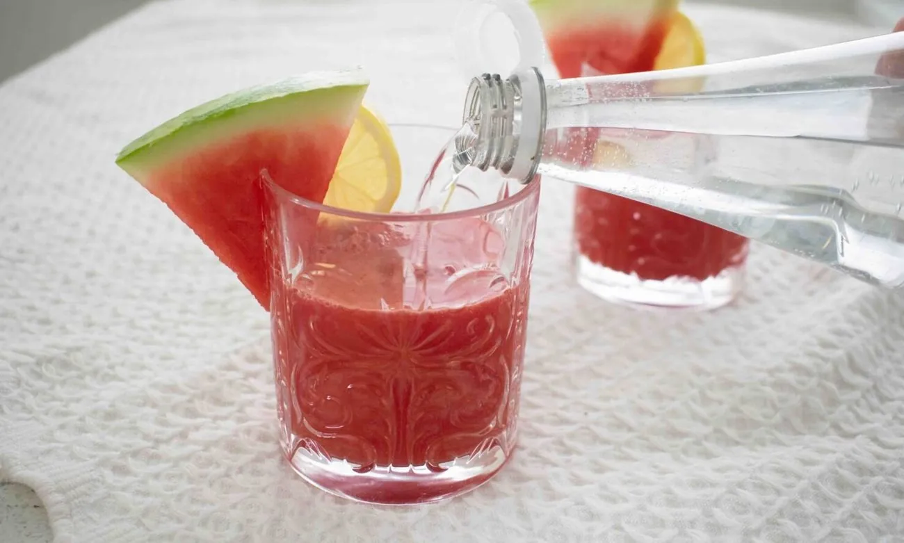 В стакан вылейте часть арбузной смеси и налейте газированной воды. По желанию добавьте лед.