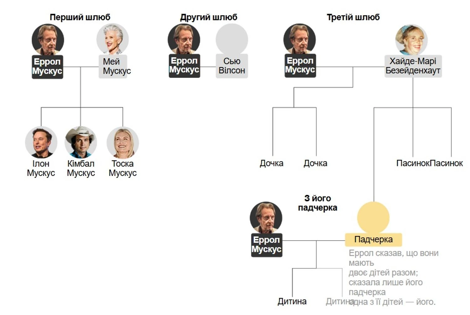 Эррол Маск был женат трижды. Первый брак – с Мэй Голдеман, у них родились Илон, Тоска и Кимбал. После развода и второго брака он женился в третий раз на Хайде-Мари Безуйденхаут, у которой было трое детей от первого мужа. По данным семьи, у госпожи Безуйденхаут были проблемы с психическим здоровьем.